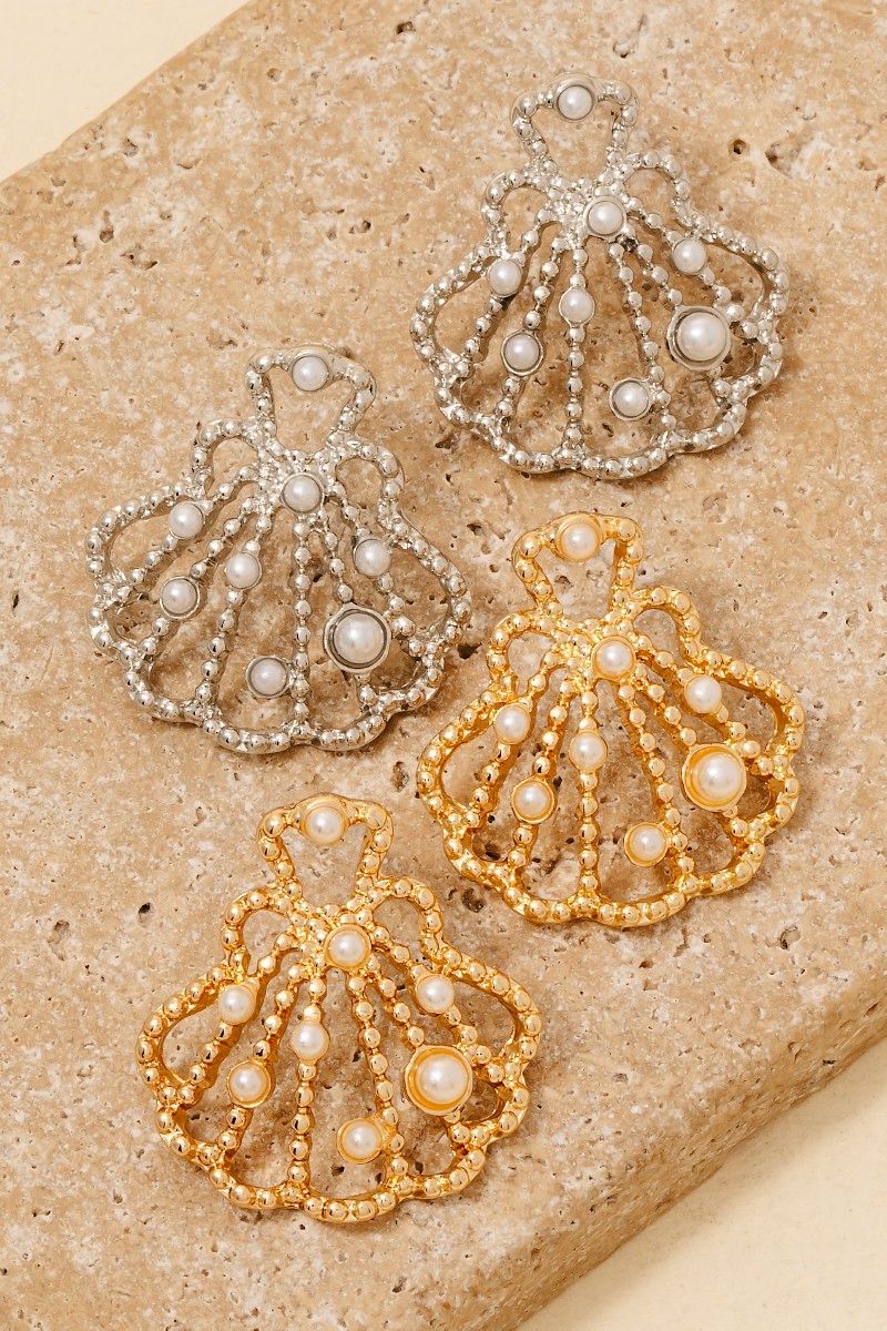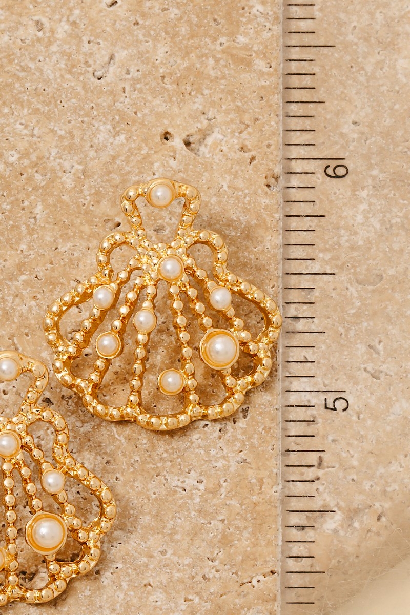 This pair of drop earrings features a fashionable pearl studded metallic clam shell stud style. Immerse yourself in the world of understated glamour as this pair of drop earrings effortlessly exudes timeless appeal.