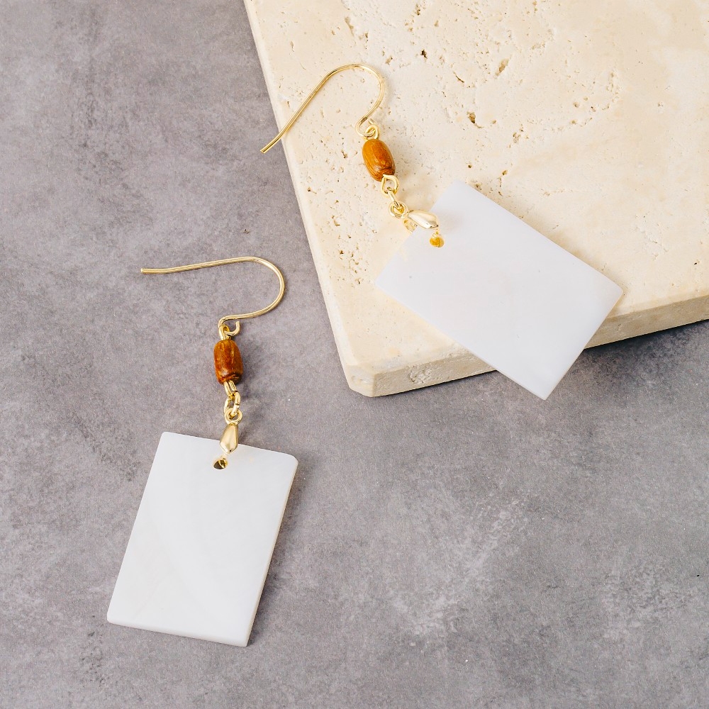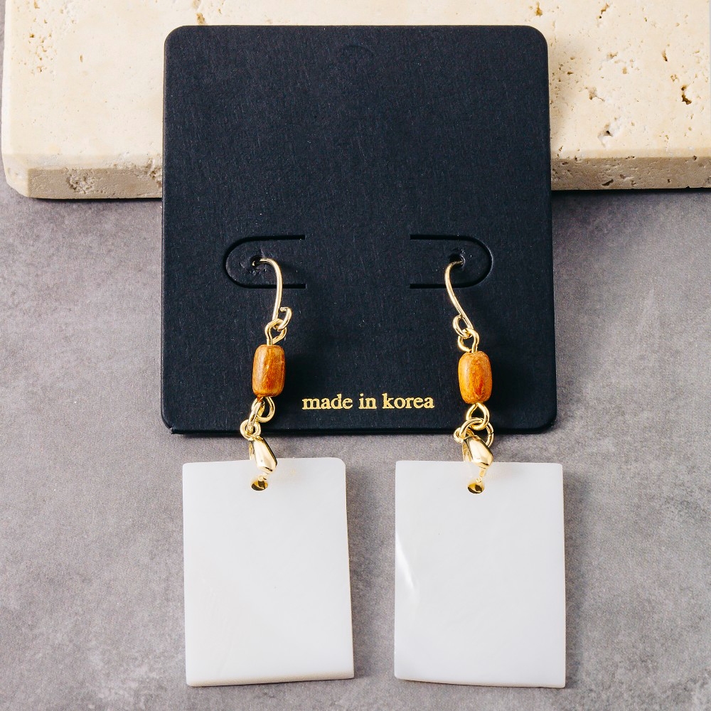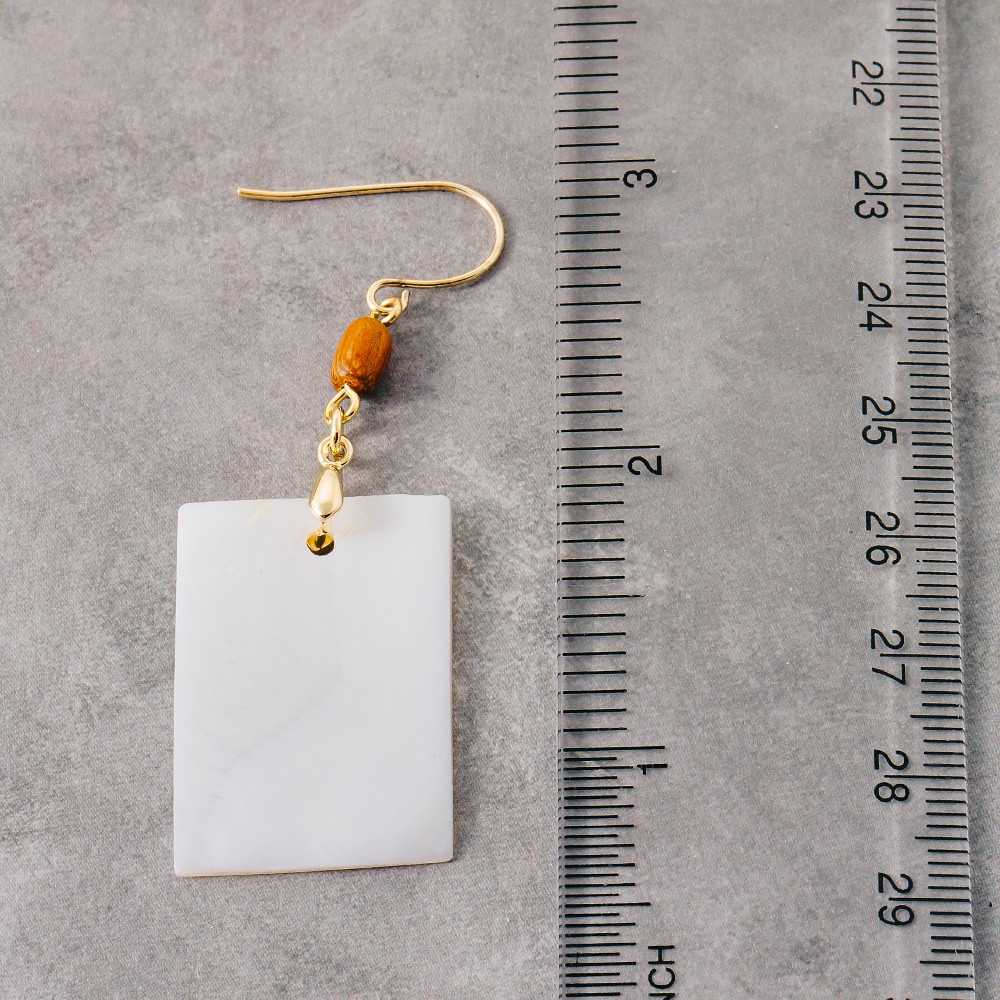 This pair of dangle earrings is made with 10% Brass, 30% Wood and 60% Shell.