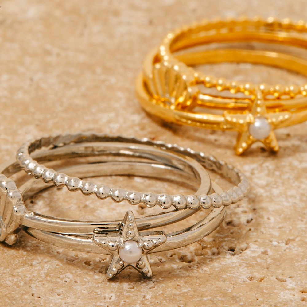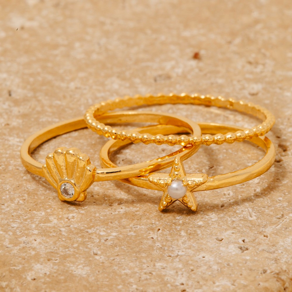 - Make a bold statement, this ring set incorporates a remarkable 3pc cubic zirconia seashell and star band rings set design. Perfect for adding a pop of color or texture to any outfit, this ring set is a must-have. Available in GDCRM, RHCRM. This item is sold in packs of 1.