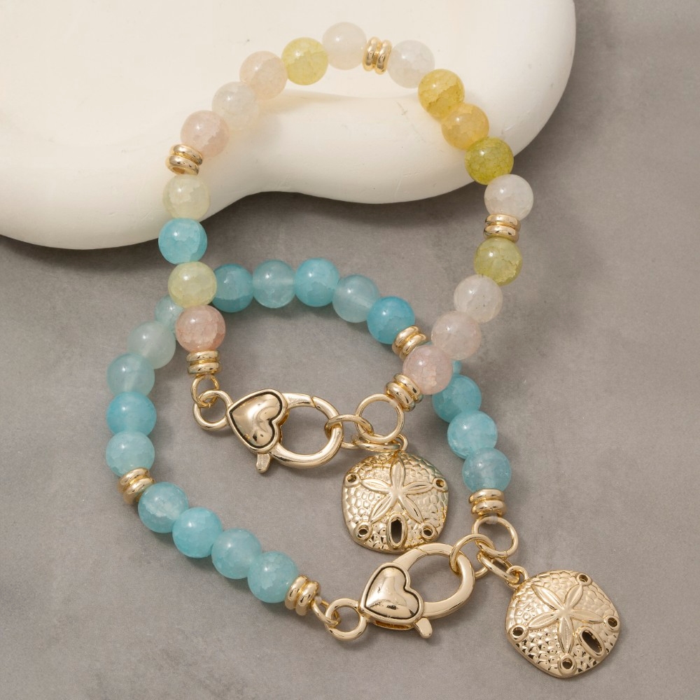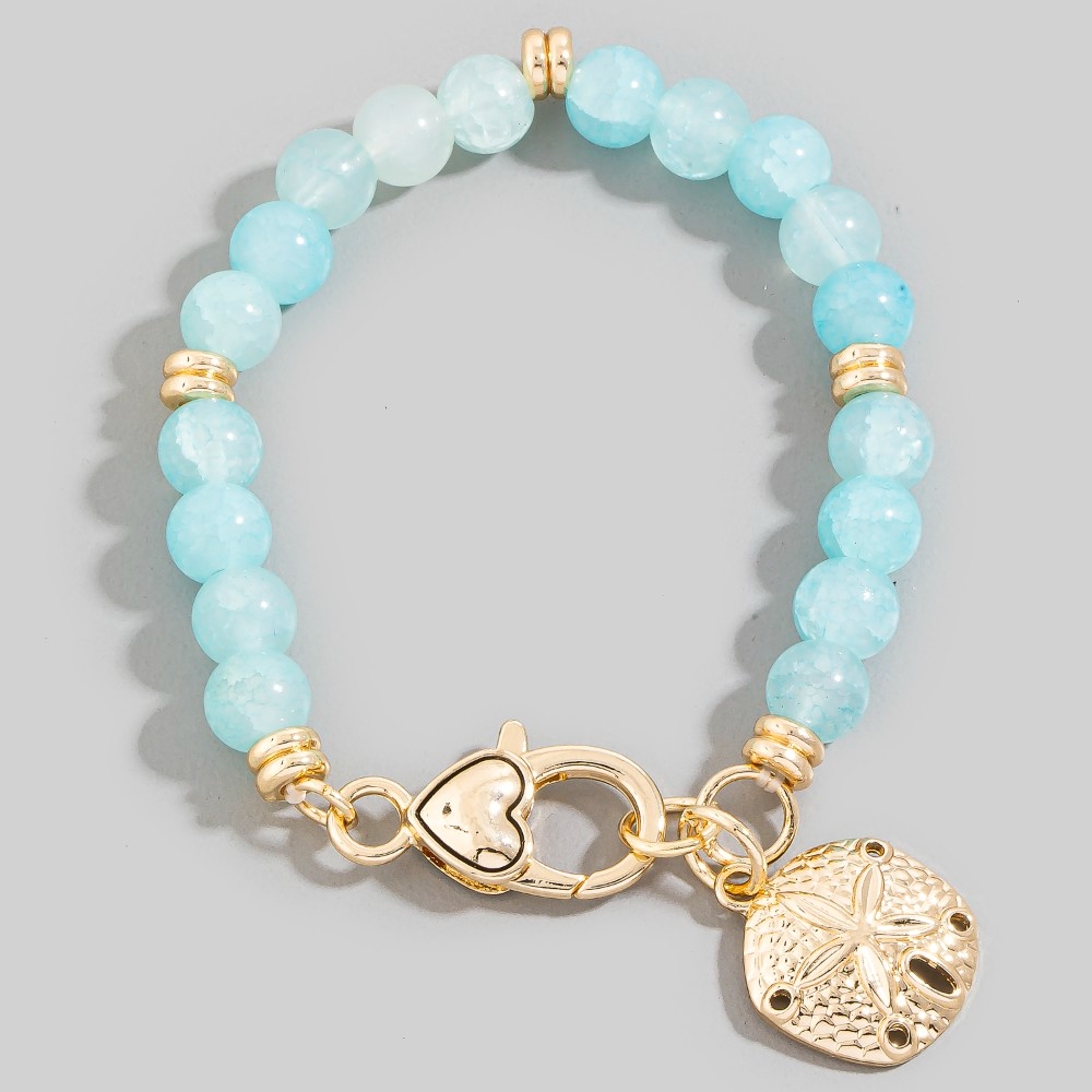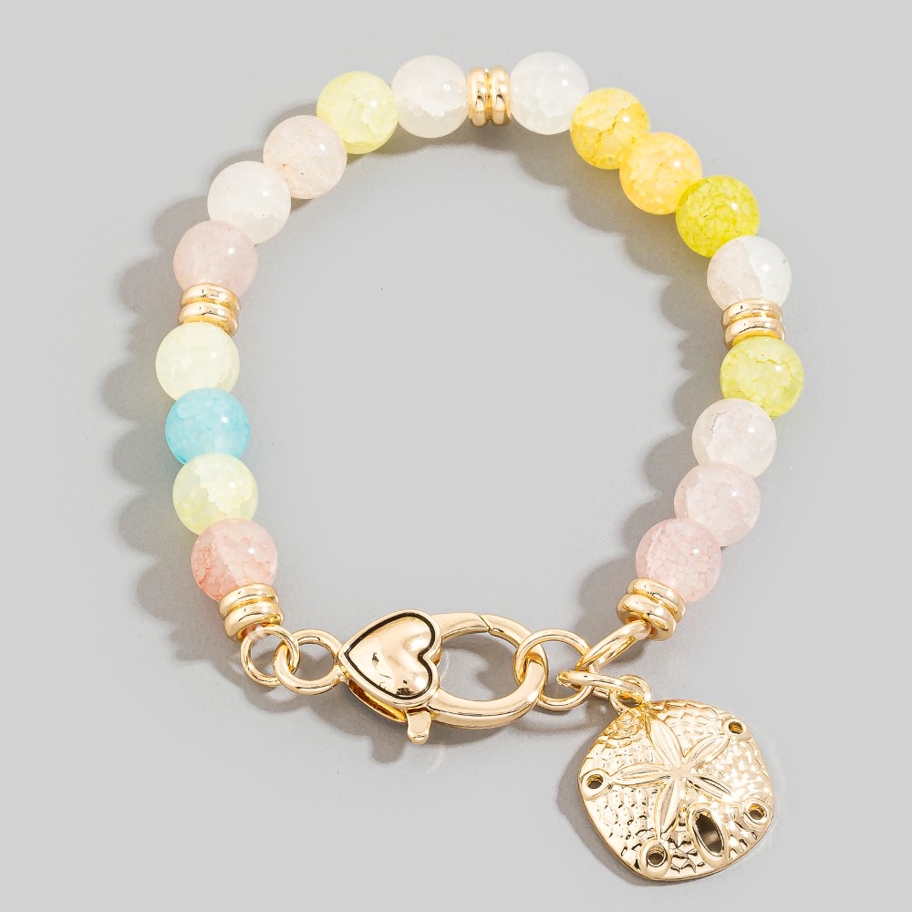A contemporary masterpiece, this bracelet exudes a refined sand dollar charm and heart clasp glass beaded design. Experience the transformative power of this versatile bracelet, effortlessly enhancing the overall aesthetic of your outfit. Available in GBL, GMT. This item is sold in packs of 1.