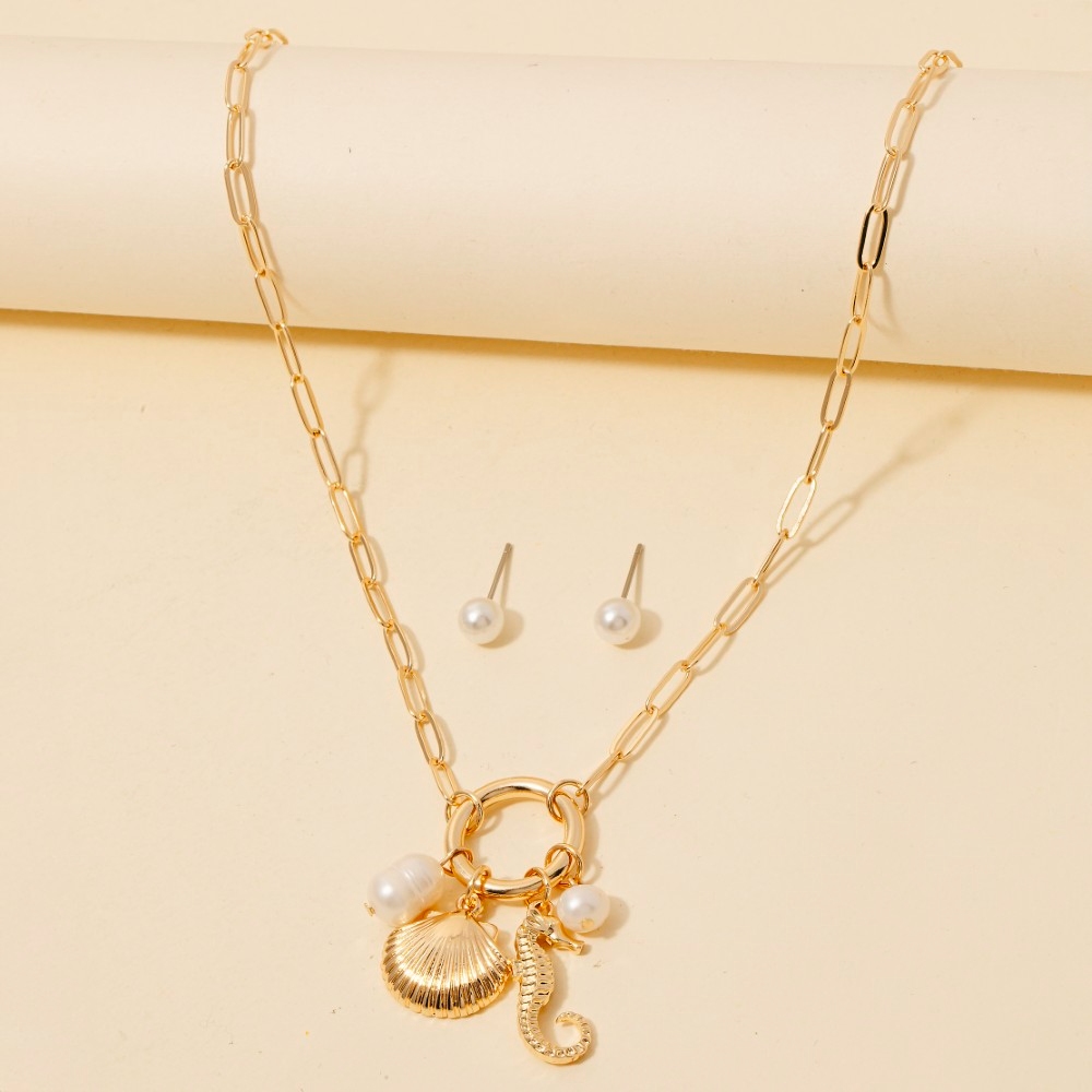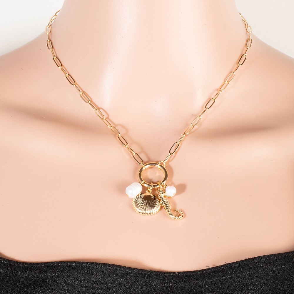 • Make a statement, this chain necklace shows off a distinctive seahorse pearl and clamshell charms set design. A must-have chain necklace that adds a unique flair to any look. Available in CRMGD. This item is sold in packs of 1.