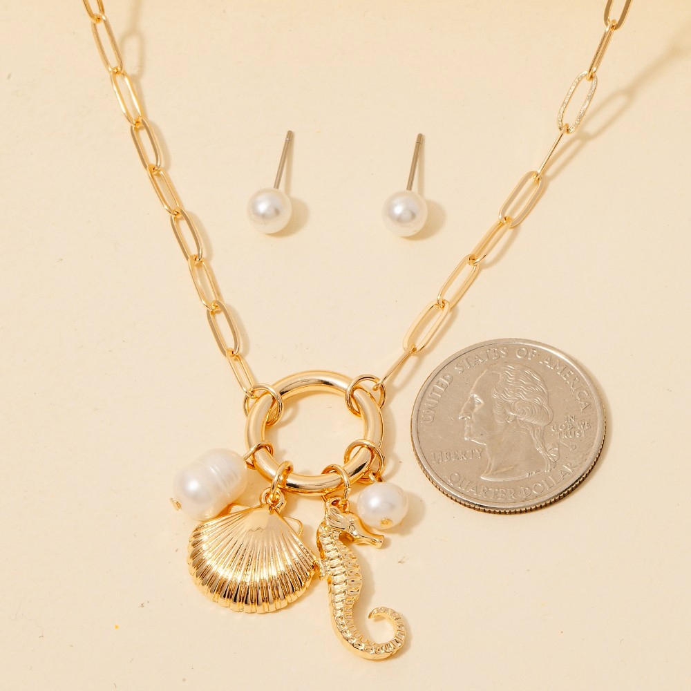 Mixed Sea Life And Pearl Charms Chain Necklace