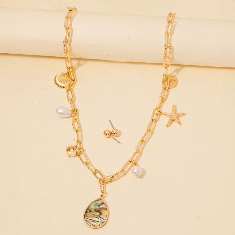 Metallic Sea Life Charms Pearl Beaded Necklace