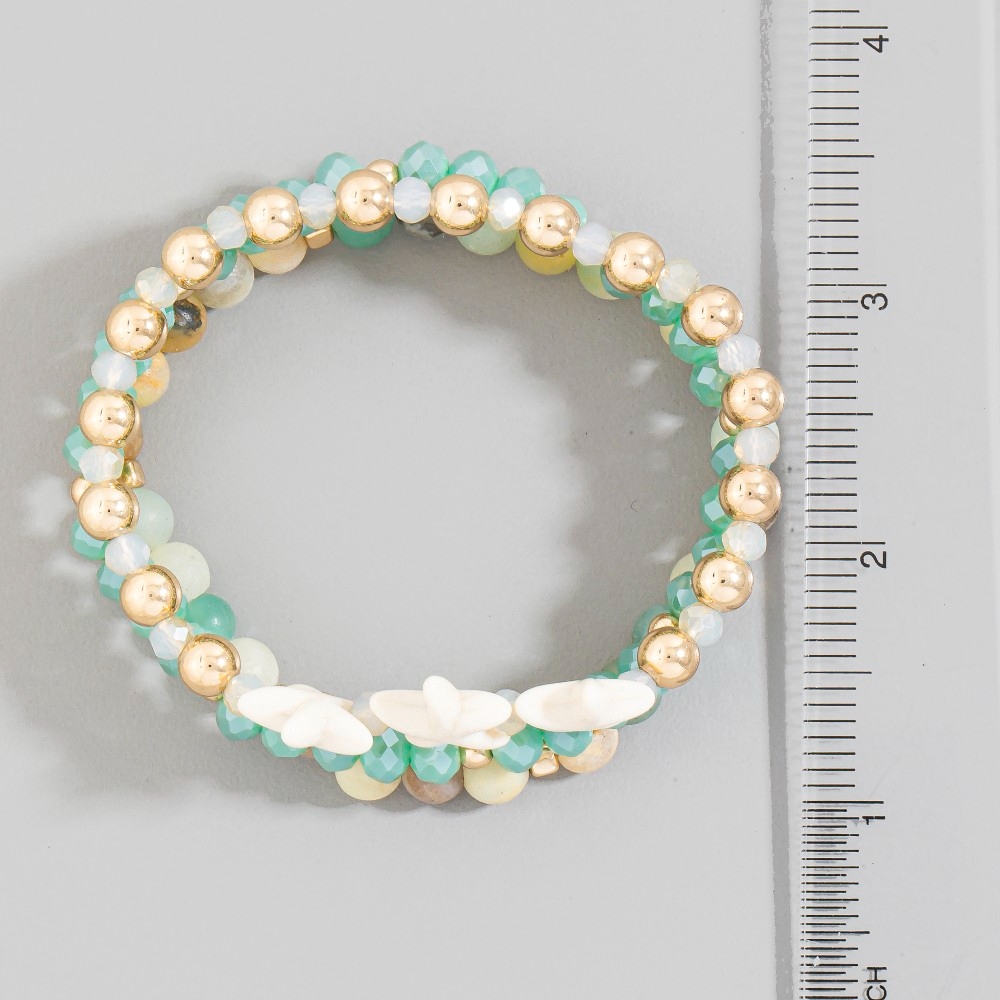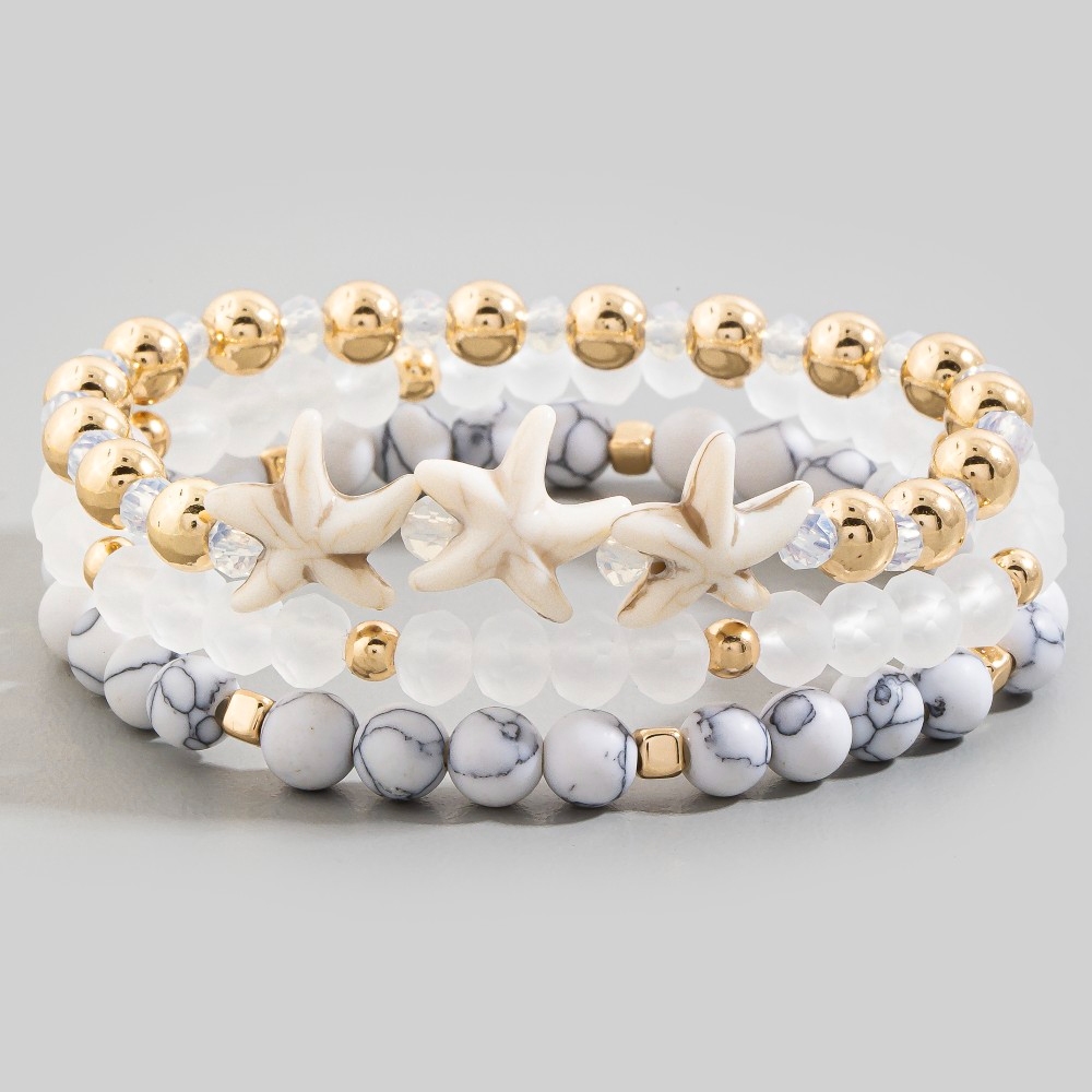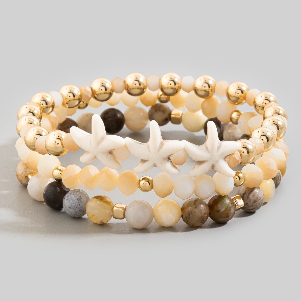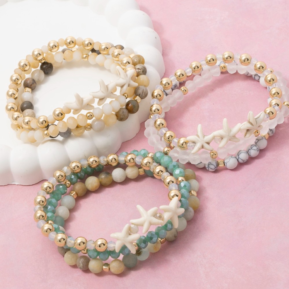 Add a touch of luxury to any outfit, this bracelet incorporates a remarkable starfish charms mixed beaded set design. Perfect for adding some personality and flair to your wardrobe, this bracelet is a must-have. Available in GDMINT, GDNAT, GDWHT. This item is sold in packs of 1.