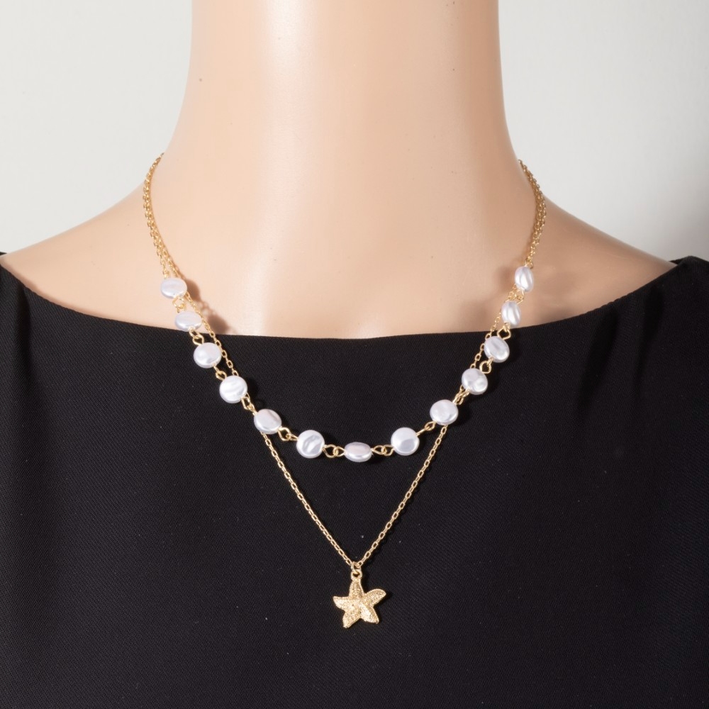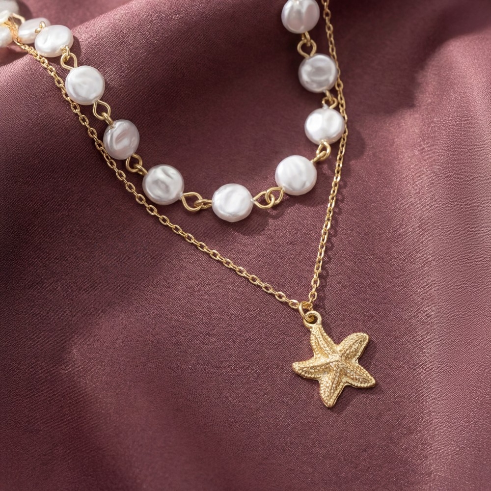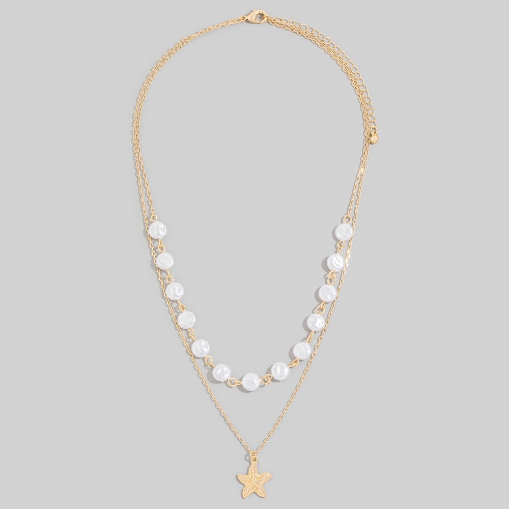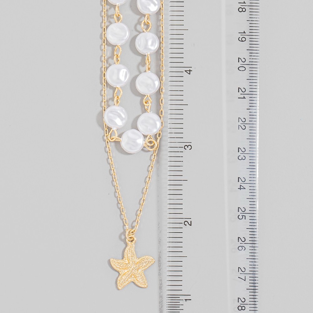 - Sleek, modern, and always stylish, this pendant necklace offers a remarkable starfish pendant pearl discs layered chains necklace design. This pendant necklace is the perfect finishing touch to any outfit, adding a touch of sophistication and glamour. Available in GDCRM. This item is sold in packs of 1.