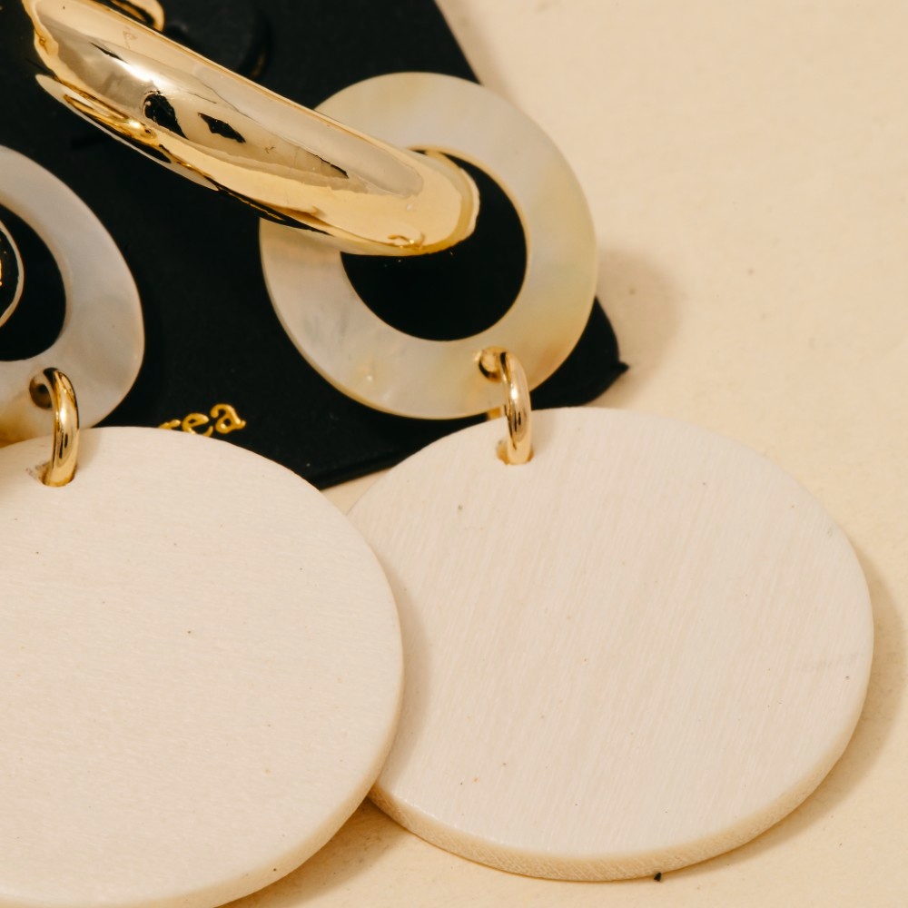 • This pair of hoop earrings is made with 40% Zinc, 10% Shell and 50% Wood.