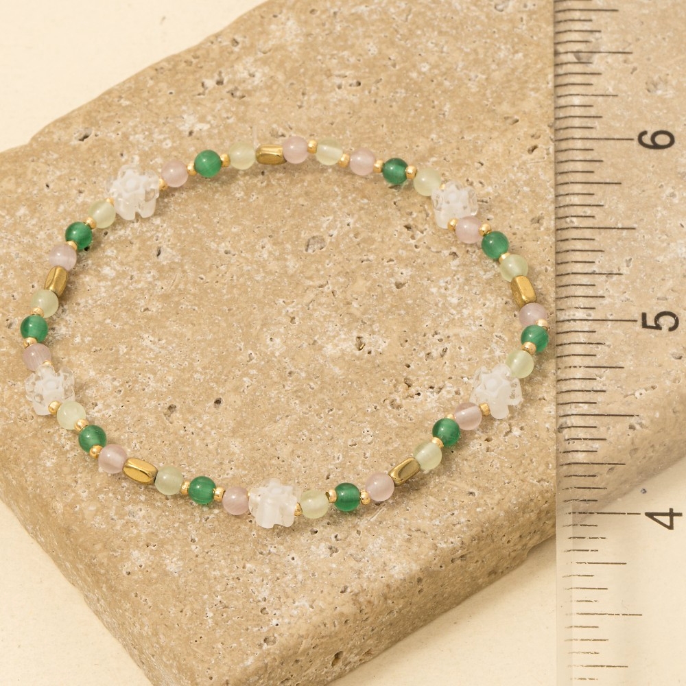 Make a statement, this bracelet radiates a sleek glass beaded flower design. Elevate your fashion statement with this versatile bracelet, adding a touch of glamour to your everyday look. Available in BL, GN, MI. This item is sold in packs of 1.