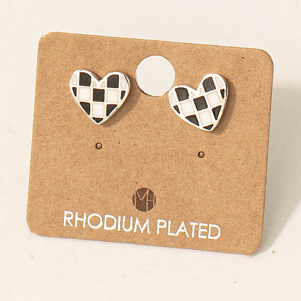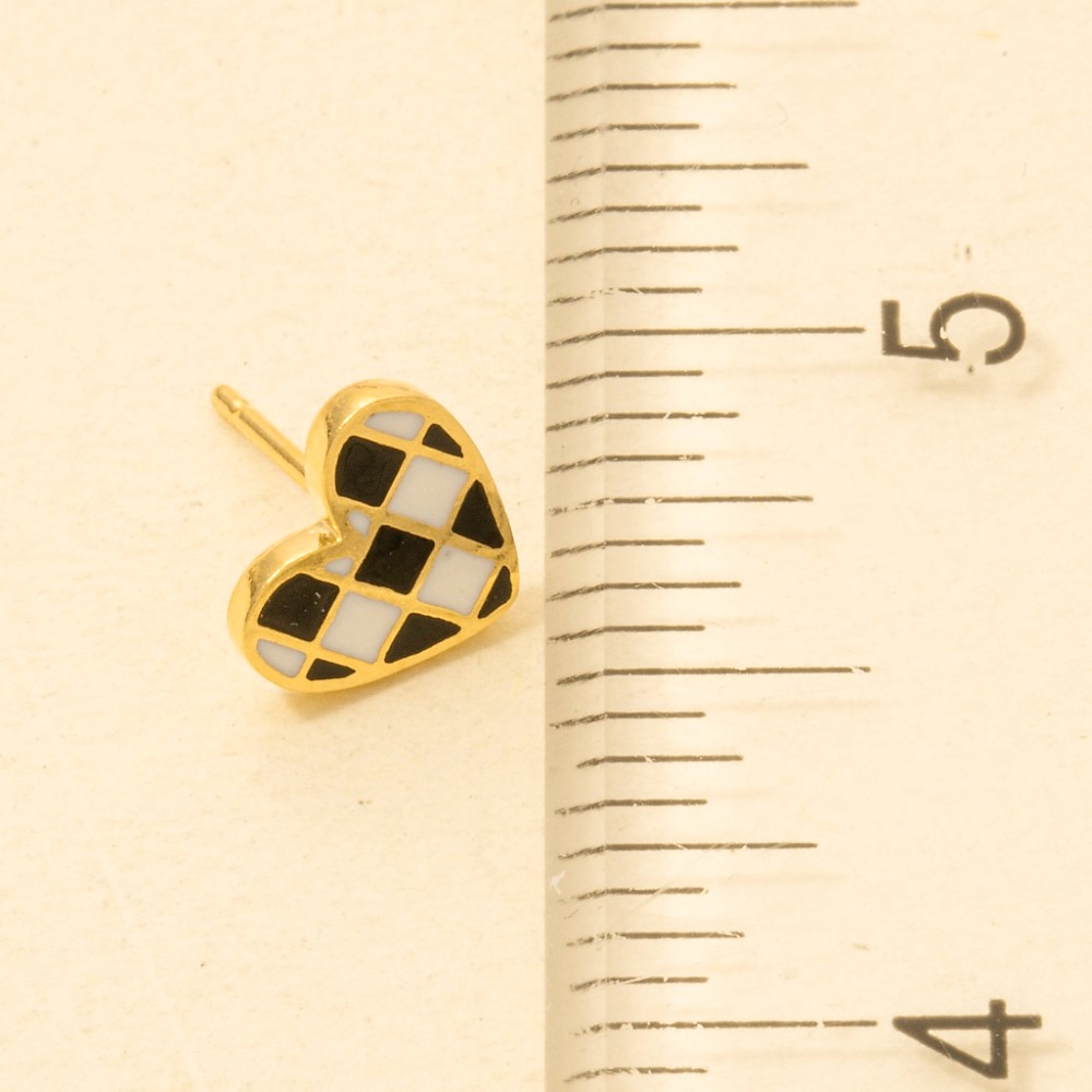 • This piece is designed to make a statement, this trending pair of earrings incorporates a flawless gold dipped epoxy checkered heart stud earrings design. This versatile trending pair of earrings adds a touch of elegance to any outfit. This item is sold in packs of 1.