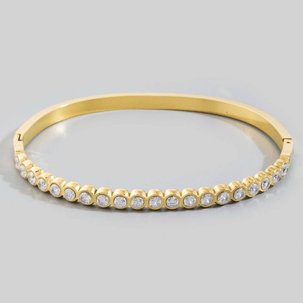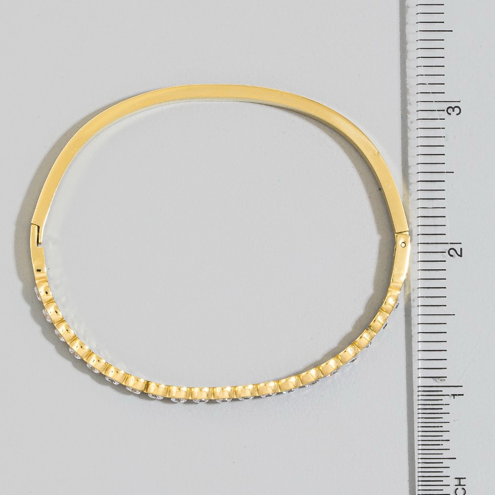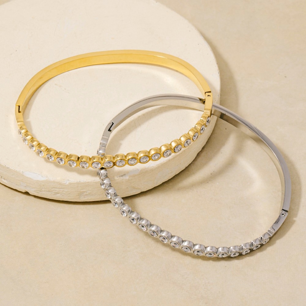 A true work of art, this bangle bracelet presents a striking stainless steel bezel set crystal hinged design. This item adds the perfect finishing touch to any outfit, making it stand out from the crowd. Available in G, S. This item is sold in packs of 1.
