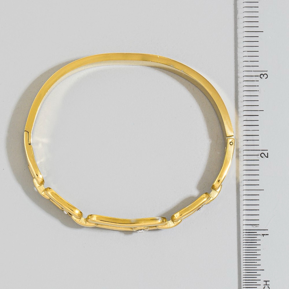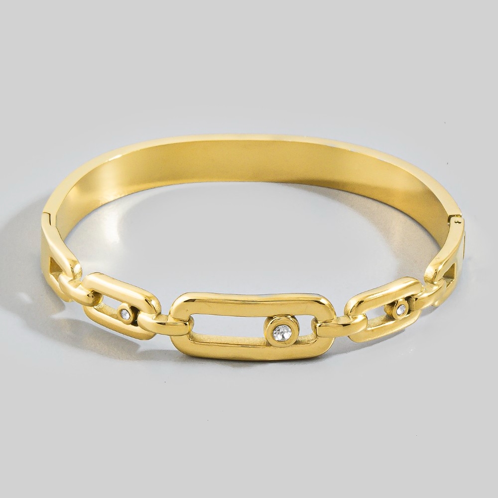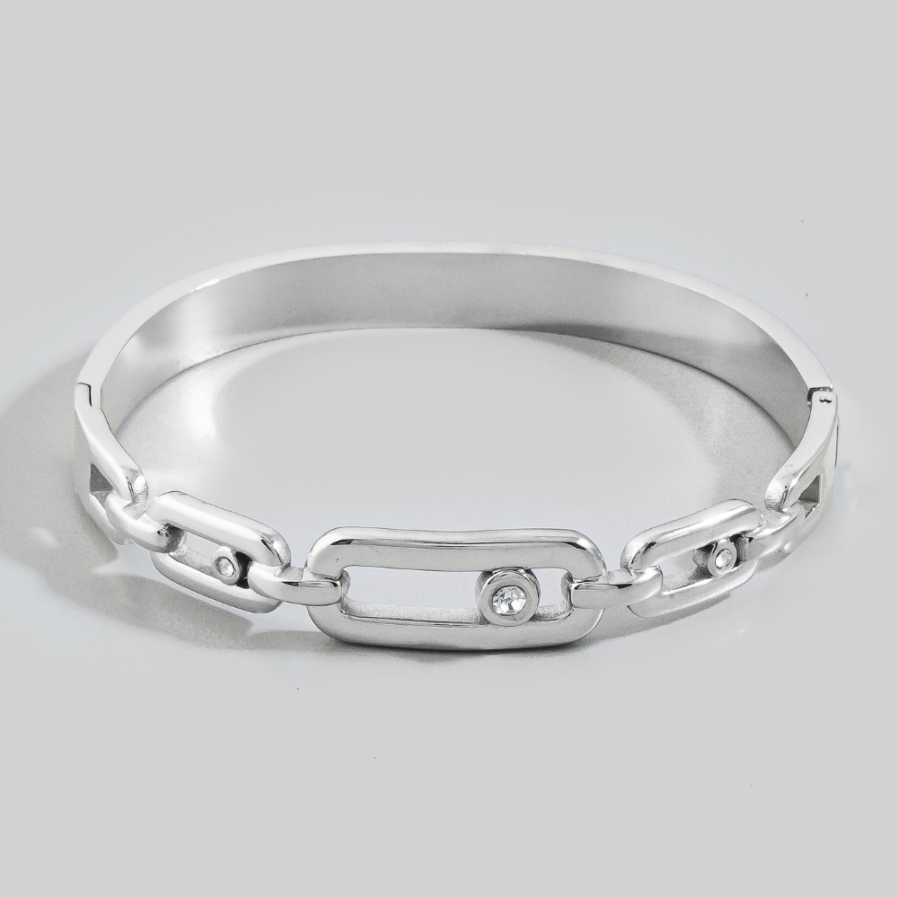 A classic design with a contemporary twist, this bangle bracelet features a distinct stainless steel chain link crystal accent hinged design. This item adds the perfect finishing touch to any outfit, making it stand out from the crowd. Available in G, S. This item is sold in packs of 1.
