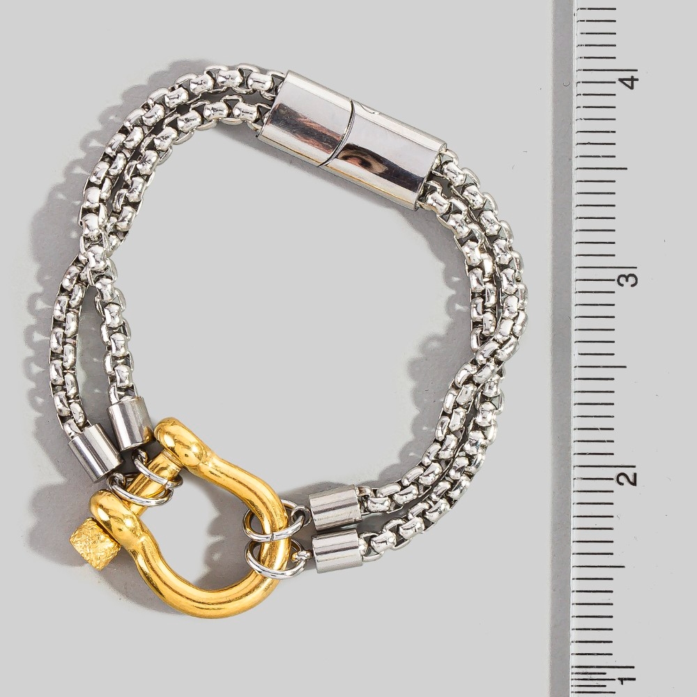 A bold and daring choice that is sure to impress, this bracelet adds a distinctive stainless steel two tone d ring layered design. Perfect for dressing up or down, this versatile bracelet adds a touch of sophistication to any look. Available in BK, NK18. This item is sold in packs of 1.