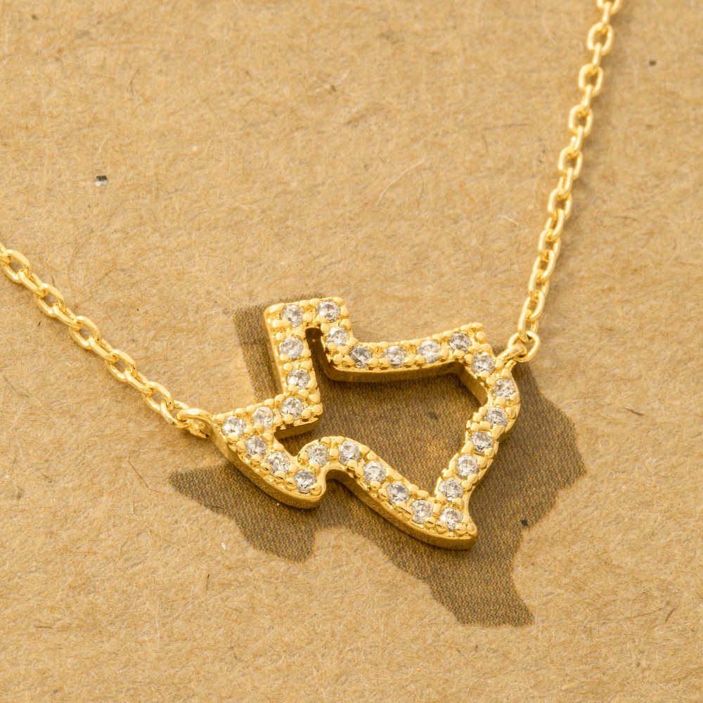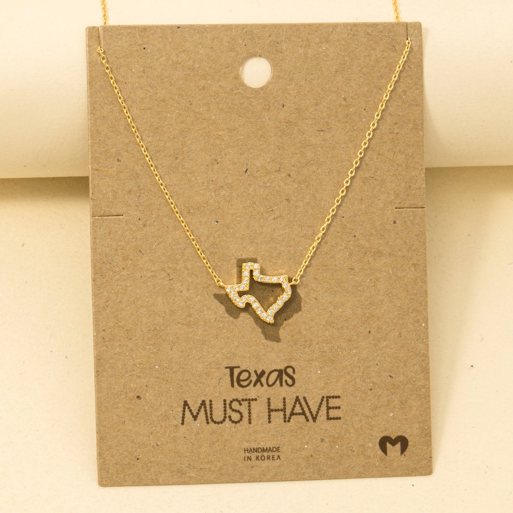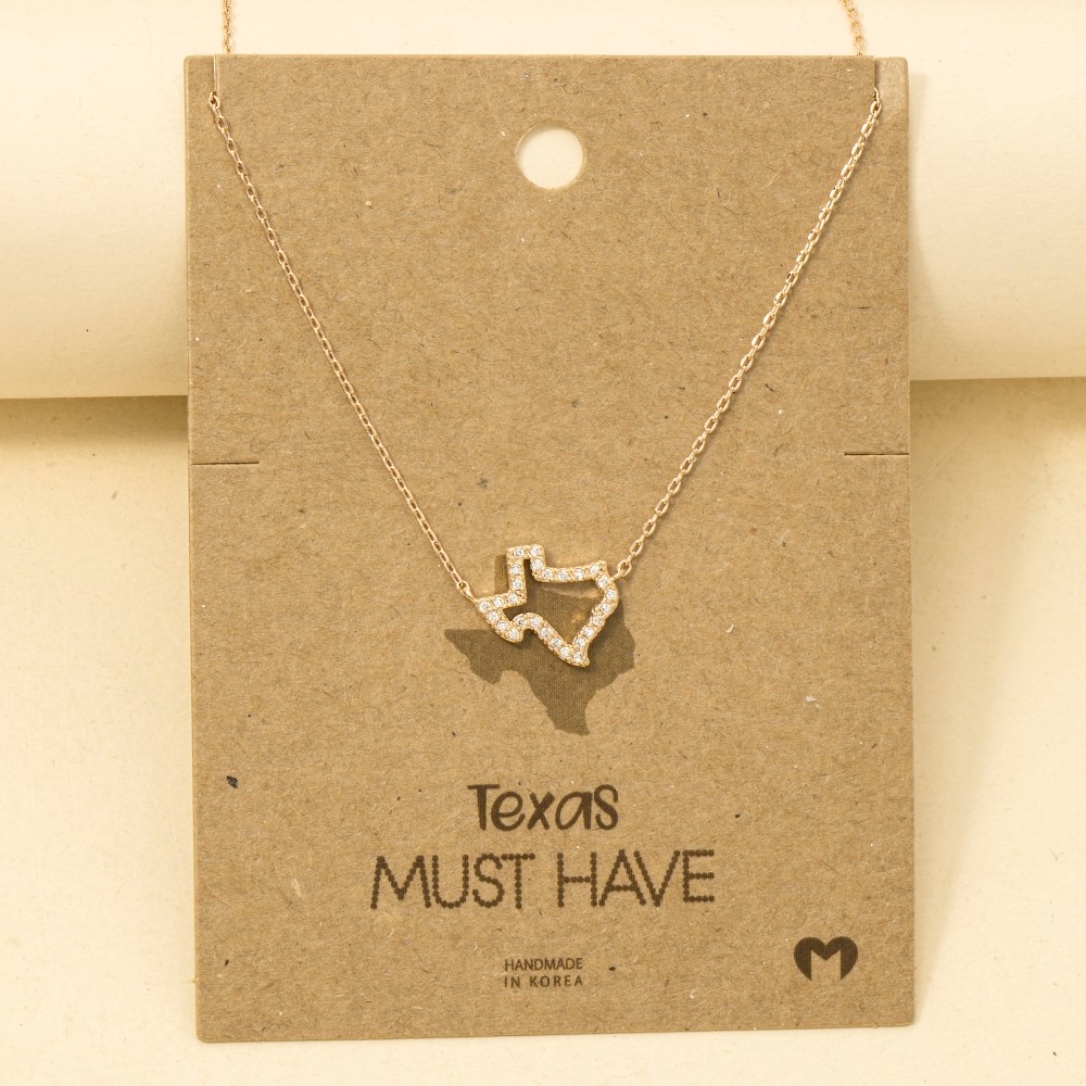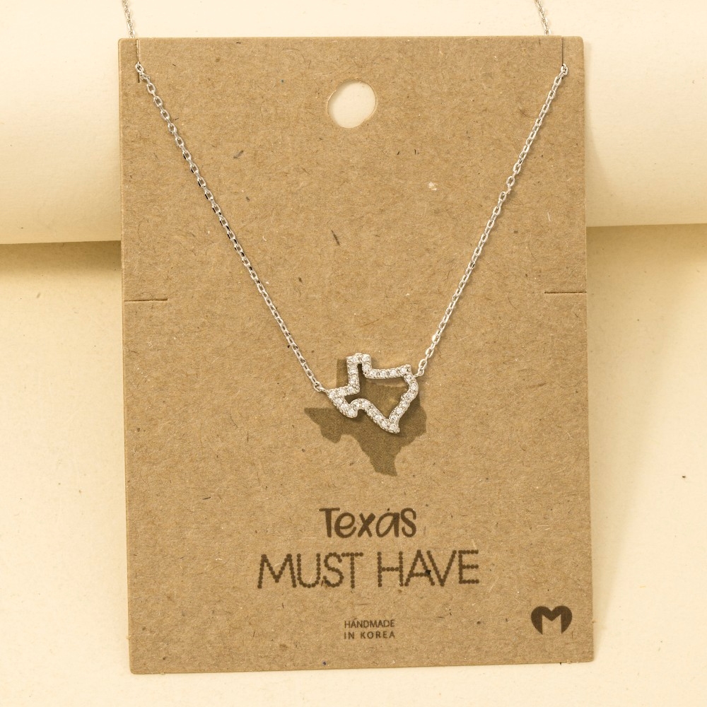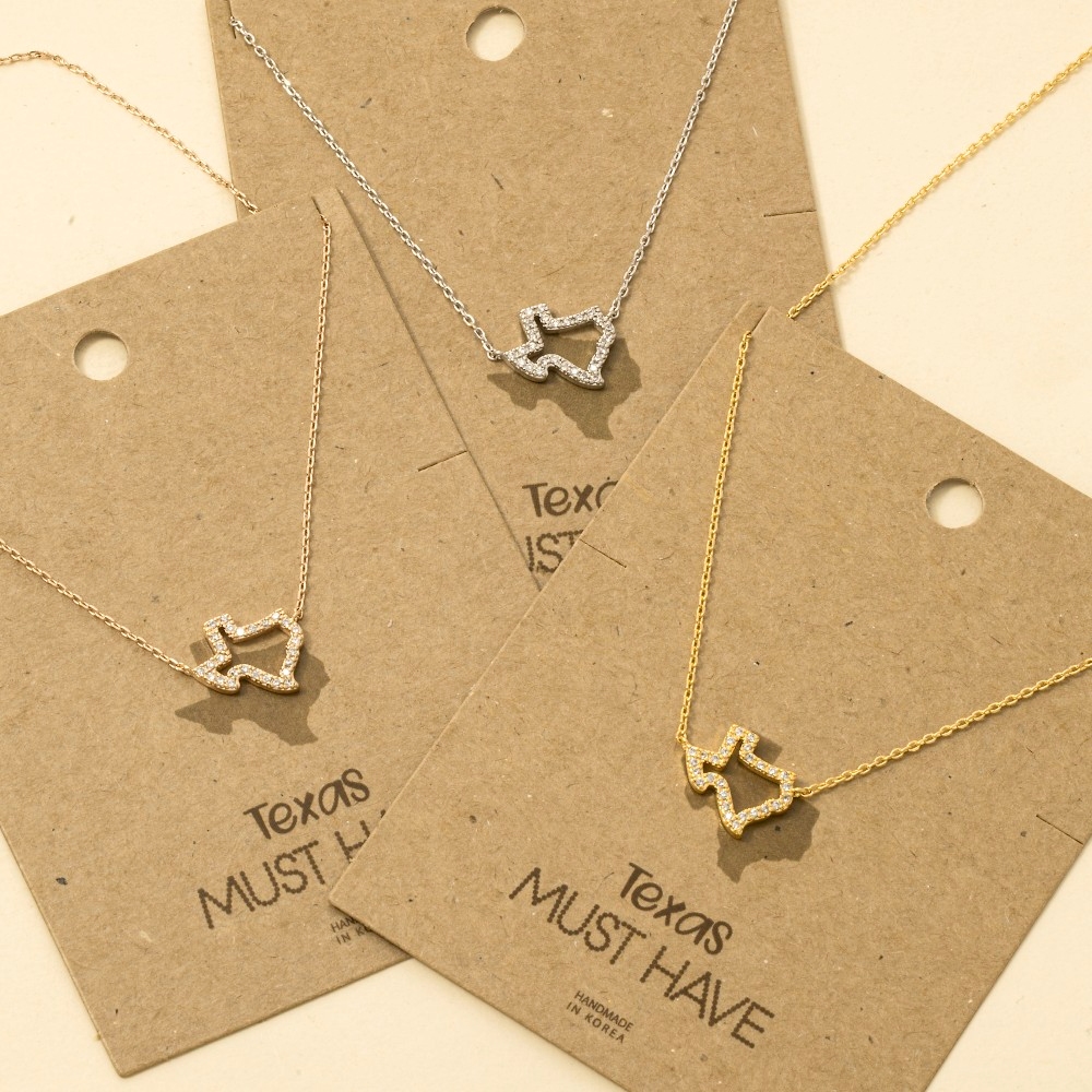 • The perfect way to add some sparkle to your outfit, this trending necklace evokes a captivating rhinestone trim texas state pendant necklace design. A perfect addition to your wardrobe that effortlessly enhances your style. Available in G, R and S. This item is sold in packs of 1.