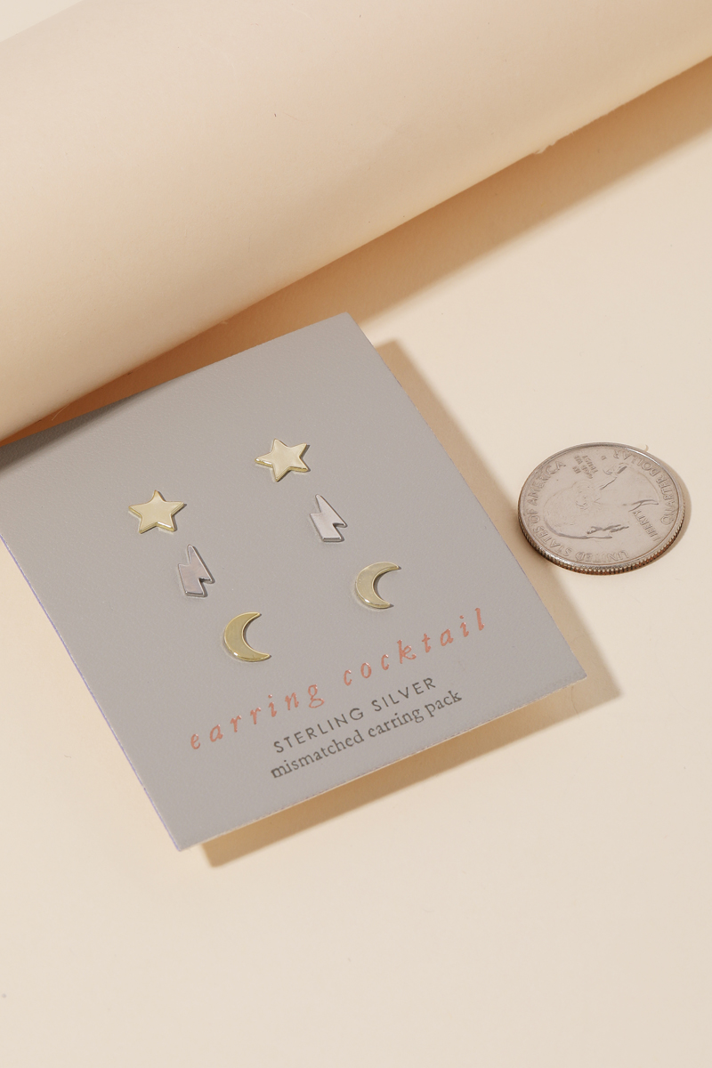 A contemporary masterpiece, this pair of earrings shows off a distinctive sterling silver moon lightning star stud earring set design. Make a lasting impression with this versatile pair of earrings, a subtle yet impactful addition to your fashion repertoire. This item is sold in packs of 1.