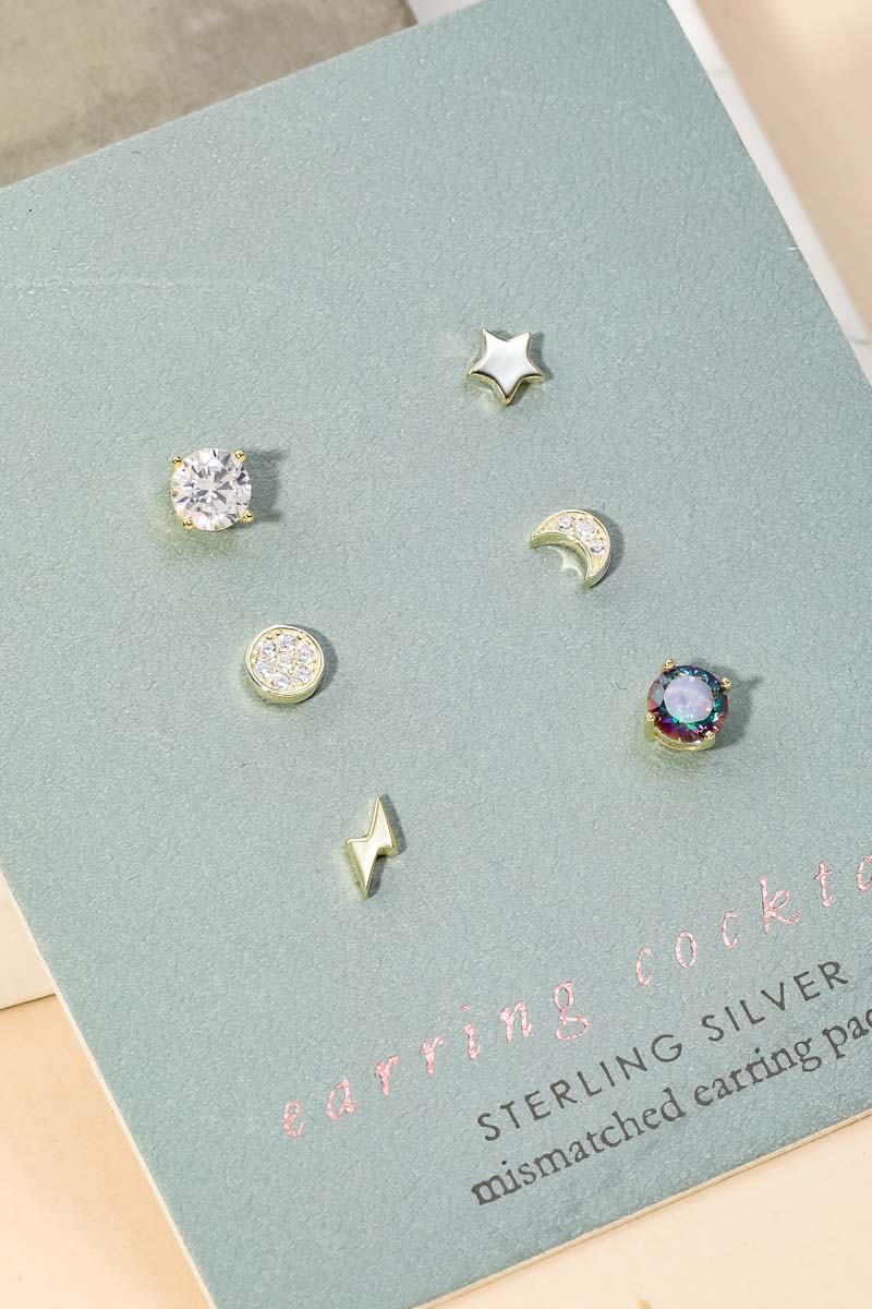 Sterling Silver Pave Moon Lightning Star Stud Earring Set