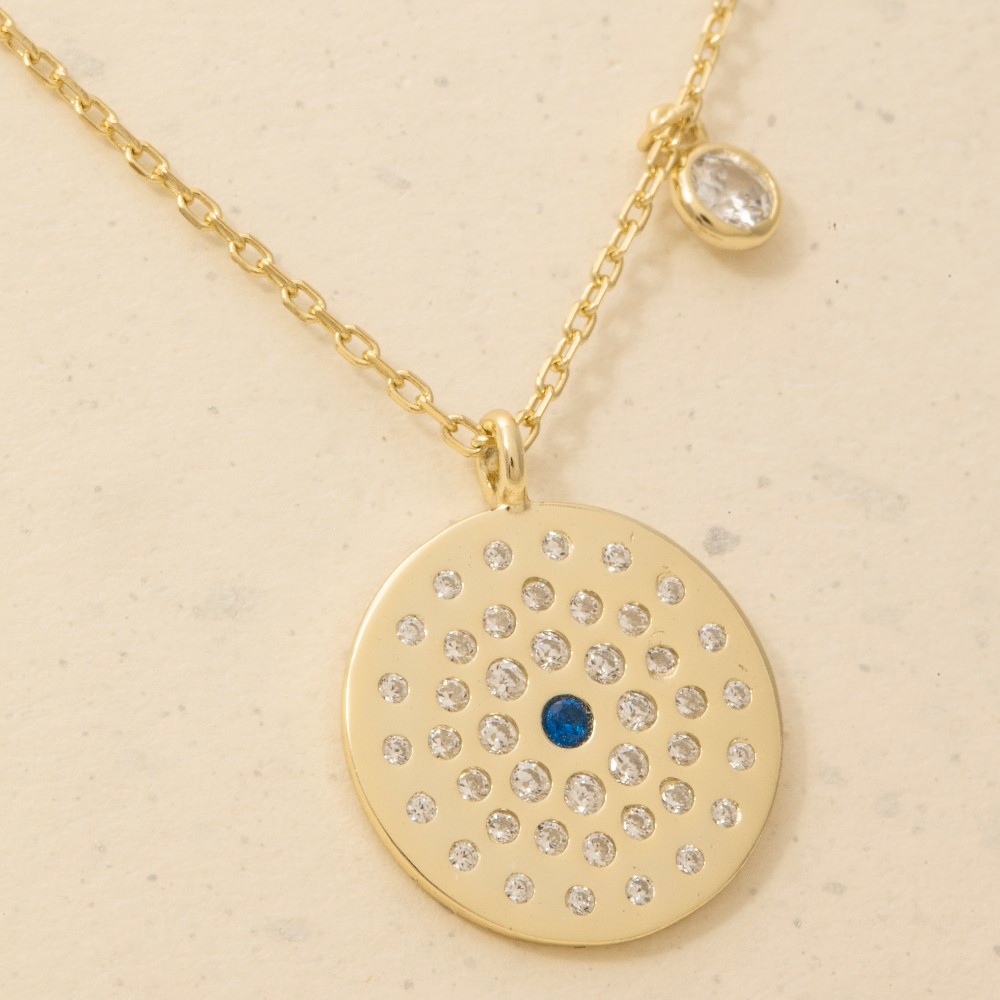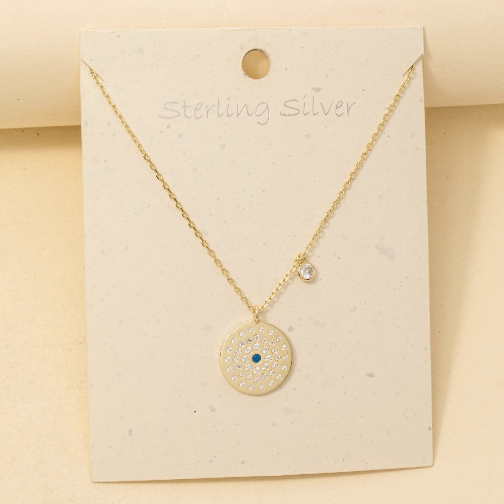 • The perfect way to add some edge to your look, this necklace flaunts a luxurious sterling silver pave disc pendant design. Transform your outfit from ordinary to extraordinary with the touch of elegance provided by this versatile necklace. Available in G. This item is sold in packs of 1.