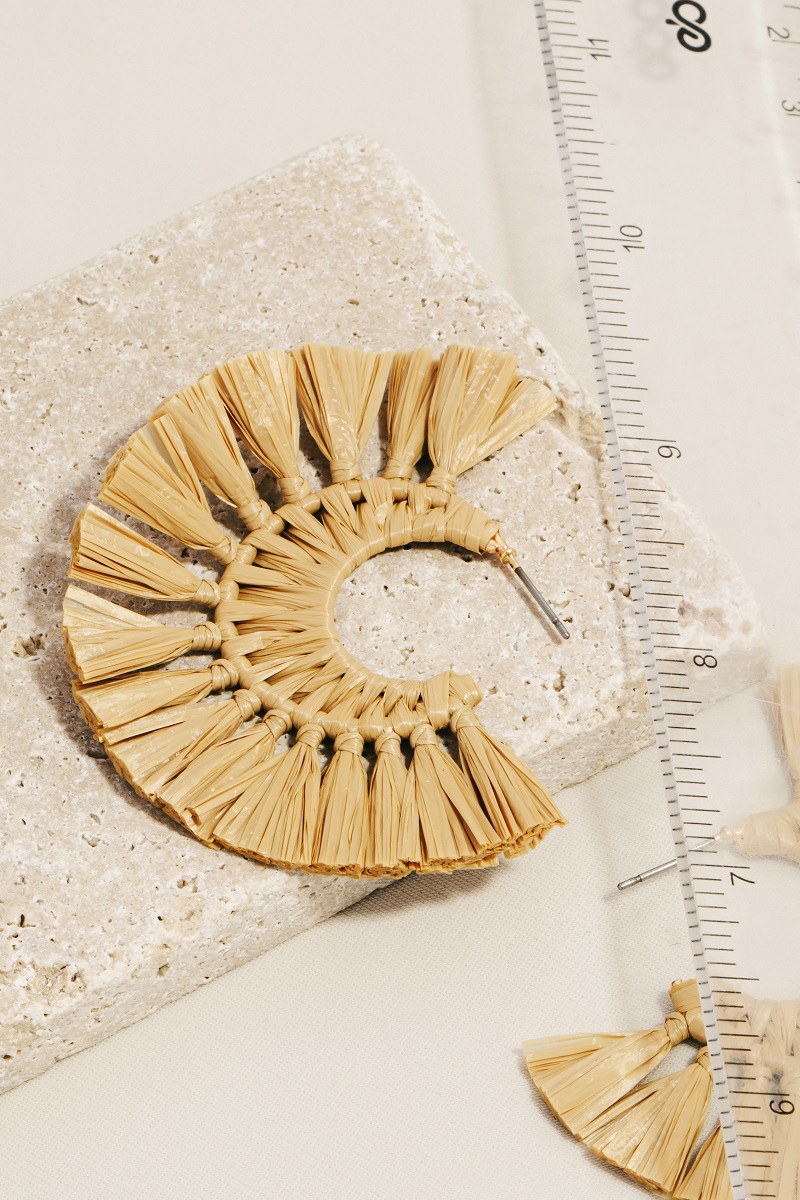 - The epitome of sophistication and style, this pair of hoop earrings boasts a magnificent straw tassel fan design. Unleash the potential of your wardrobe with this versatile accessory, ensuring a touch of elegance in every ensemble. Available in IV and TA. This item is sold in packs of 1.