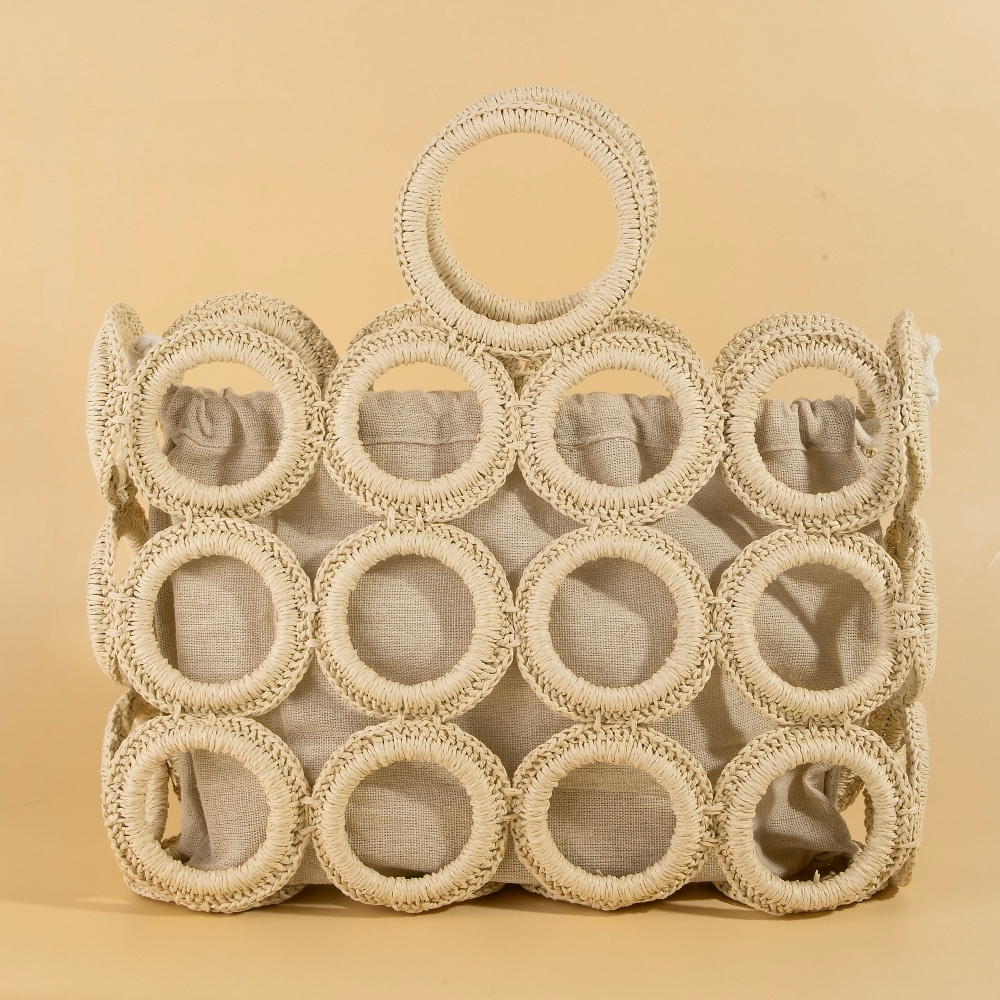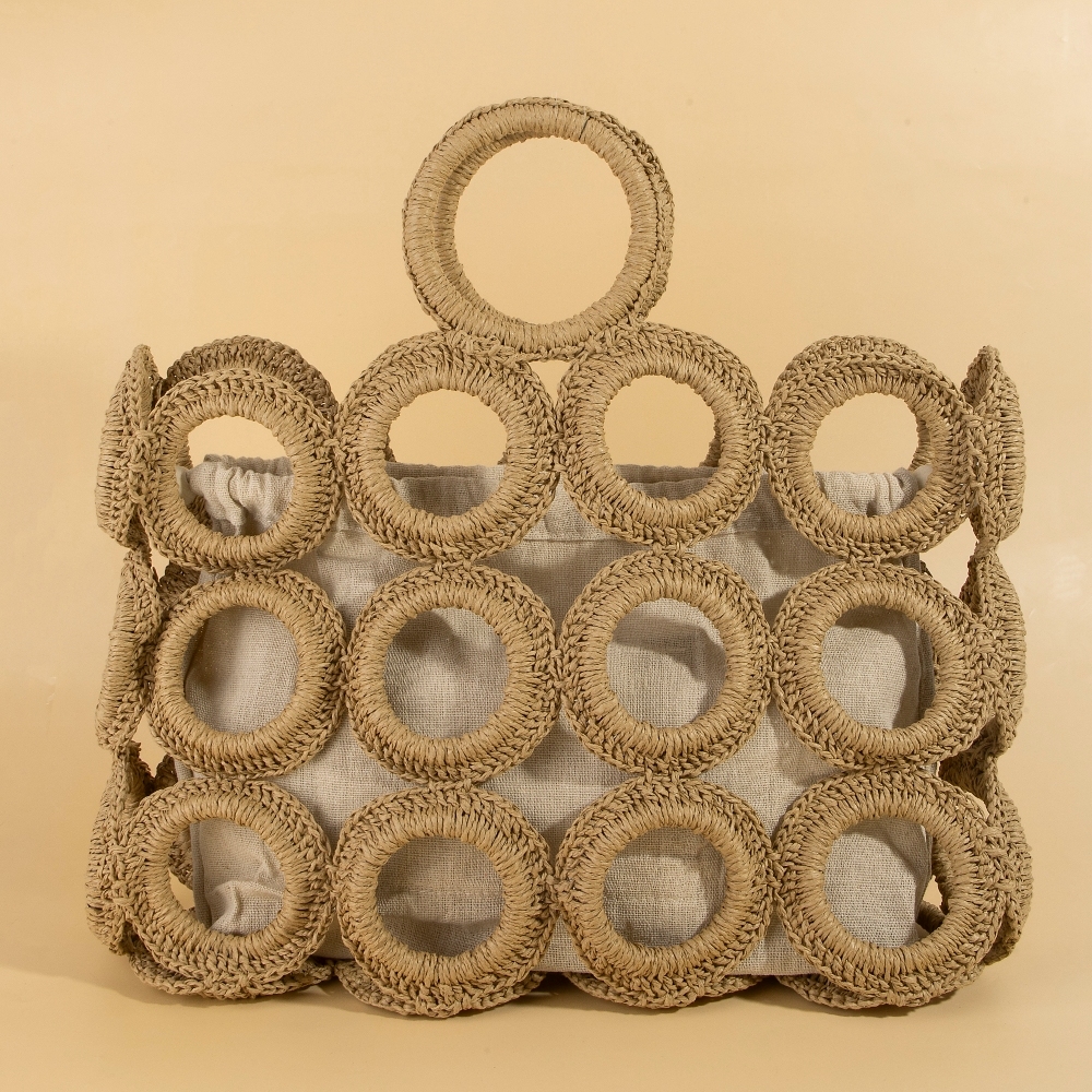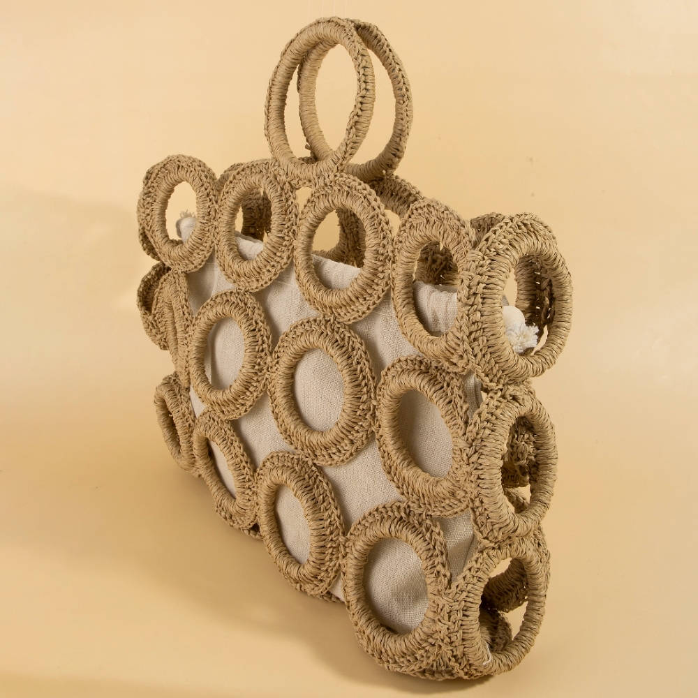 • The perfect way to add some edge to your look, this hand bag showcases an alluring straw hoop mesh design. Experience the transformative power of this versatile hand bag, effortlessly enhancing the overall aesthetic of your outfit. Available in IV, KA.