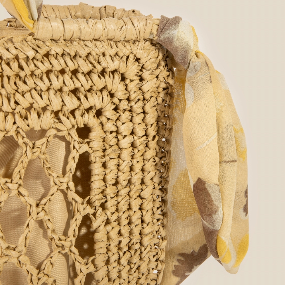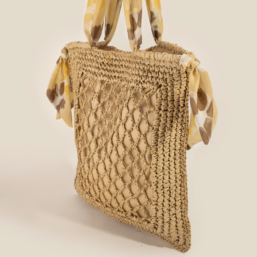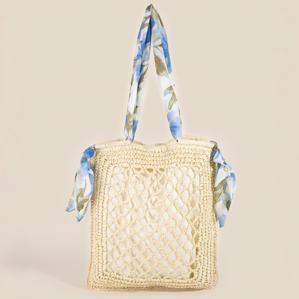 Perfectly versatile and endlessly stylish, this tote bag features a distinct tropical bandana strap straw braided design. This item is a great way to add some texture and dimension to any outfit. Available in IV, KA.