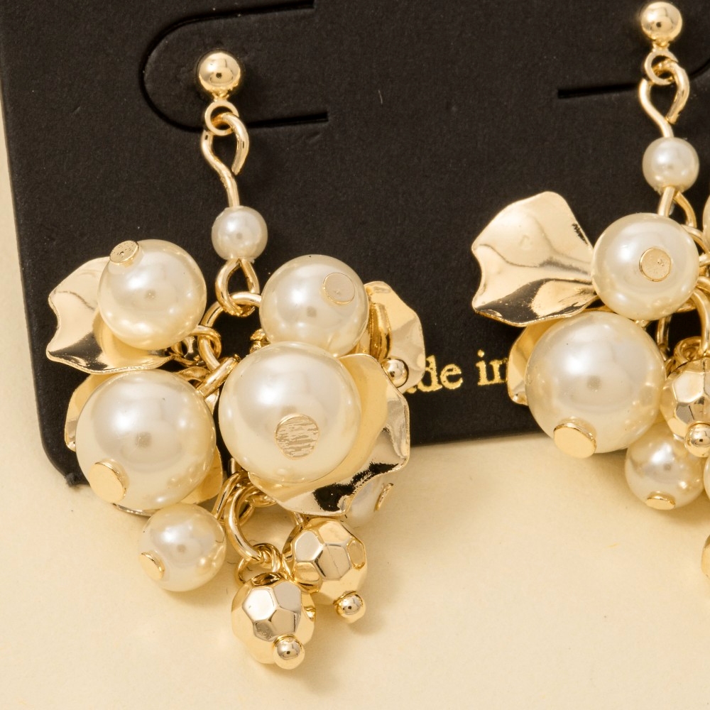 • Perfect for any occasion, this pair of dangle earrings embodies a sophisticated pearl metallic beads and petals cluster design. Perfect for any occasion, this versatile pair of dangle earrings will enhance any outfit you wear. Available in G. This item is sold in packs of 1.