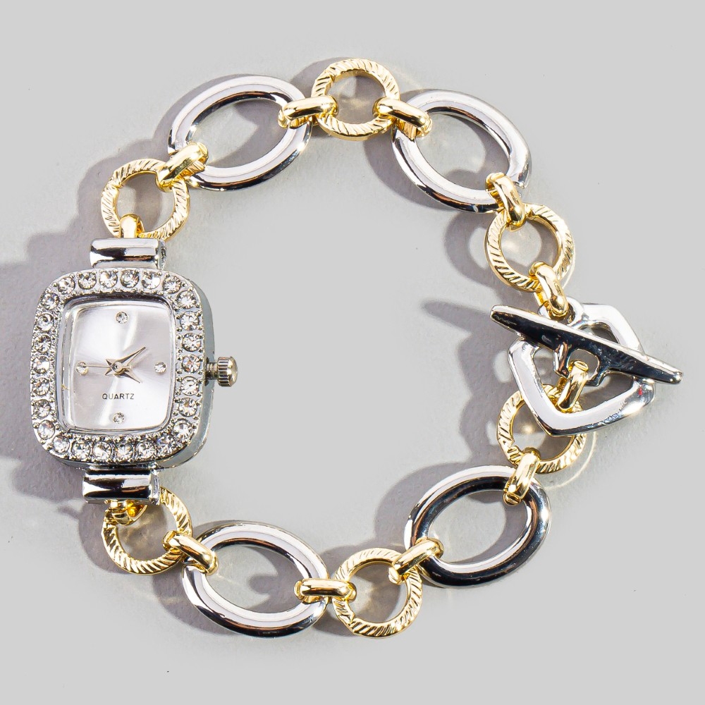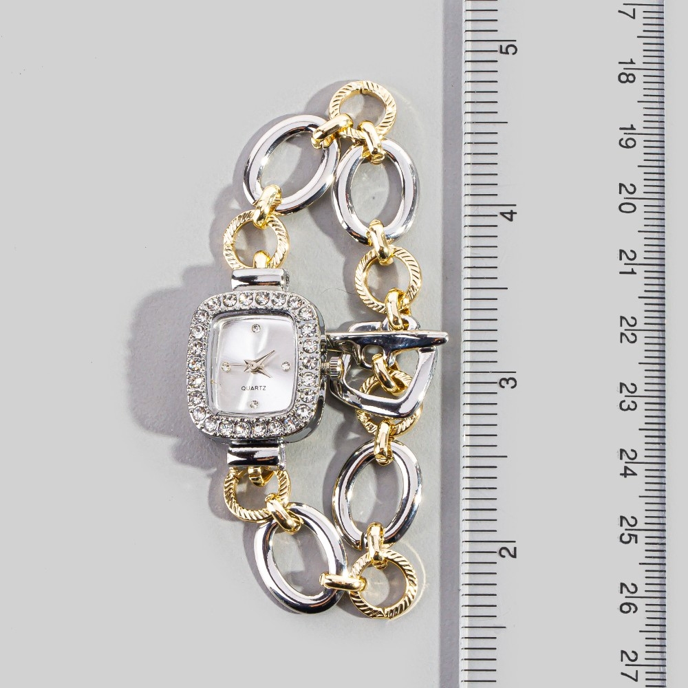 • This piece is a true showstopper, this chain bracelet includes a stunning two tone cubic zirconia toggle watch design. Add a touch of glamour to your wardrobe with this versatile chain bracelet, perfect for enhancing the elegance of any look. This item is sold in packs of 1.