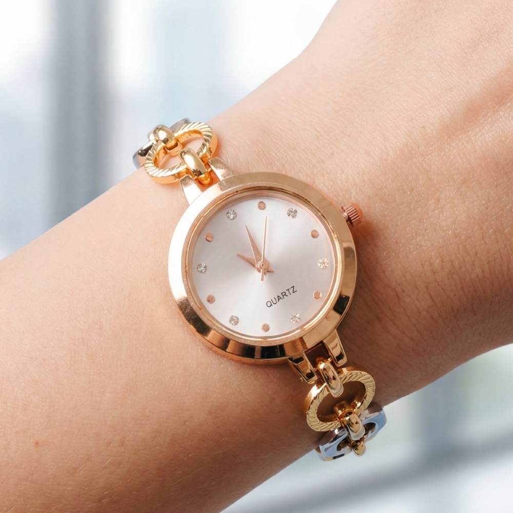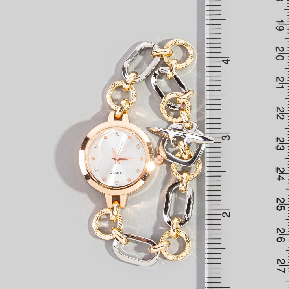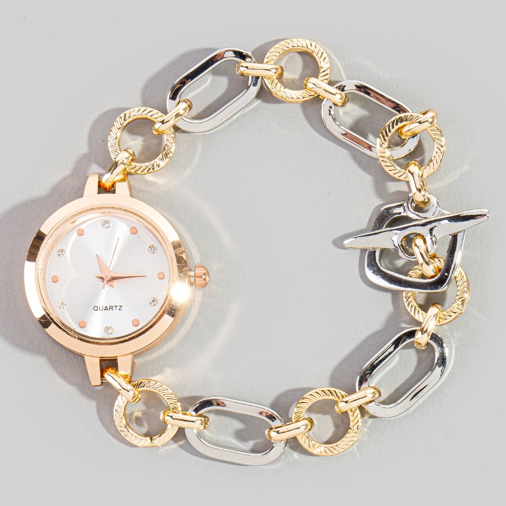 The perfect way to add some sparkle to your outfit, this bracelet evokes a captivating two tone toggle chain round watch design. Add some personality to your outfit with this stylish bracelet. This item is sold in packs of 1.