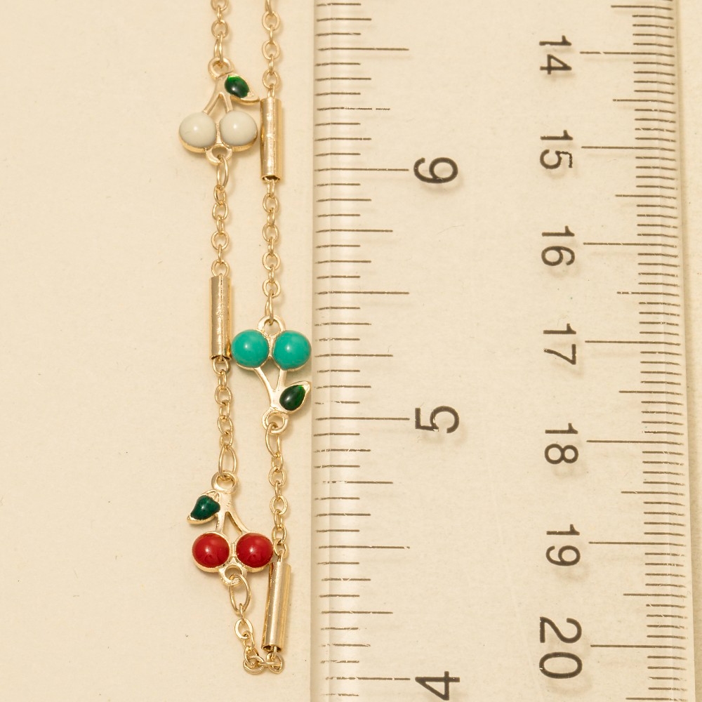 • A stunning addition to any jewelry collection, this necklace comes with a special colorful cherry fruit station design. This item is the perfect finishing touch to any outfit, adding a touch of glamour and sophistication. Available in G. This item is sold in packs of 1.