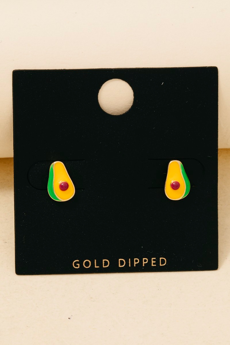 • This pair of stud earrings displays a vibrant gold dipped epoxy avocado style. Revel in the intricate design that effortlessly distinguishes this pair of stud earrings, making it a statement piece.