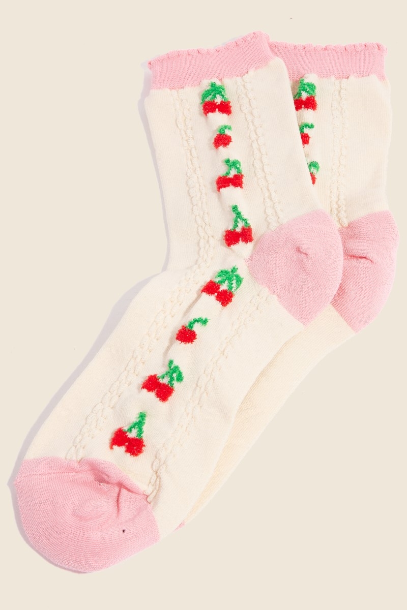 A unique and stylish piece that sets you apart, this pair of socks features an exceptional pink accent cherry embroidered beige design. This pair of socks is the perfect way to add a touch of elegance to any outfit. Available in Beige. This item is sold in packs of 1.