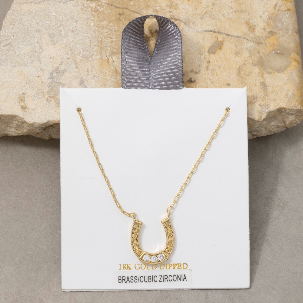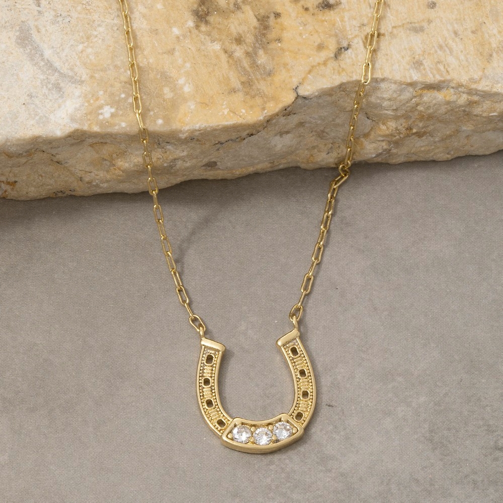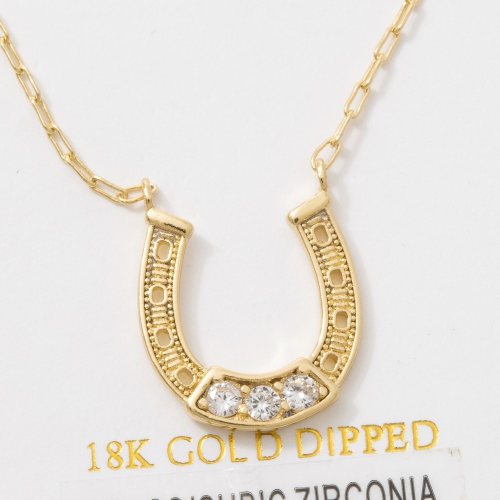 • Effortlessly chic and sophisticated, this pendant necklace encompasses a grand 18k gold dipped horseshoe cubic zirconia design. This pendant necklace is an effortless way to add some personality to your outfit. Available in GDCRY. This item is sold in packs of 1.
