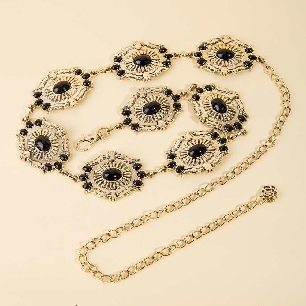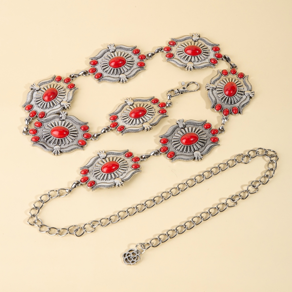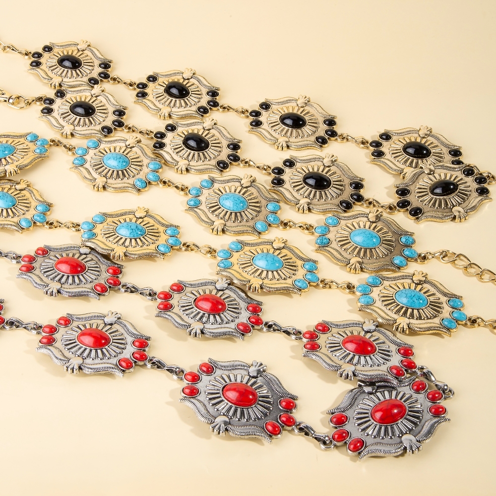 • An instant wardrobe staple, this chain belt exudes a refined intricate stone studs concho western design. Perfect for adding a pop of color or texture to any outfit, this chain belt is a must-have. Available in GBK, GBL, SRD. This item is sold in packs of 1.