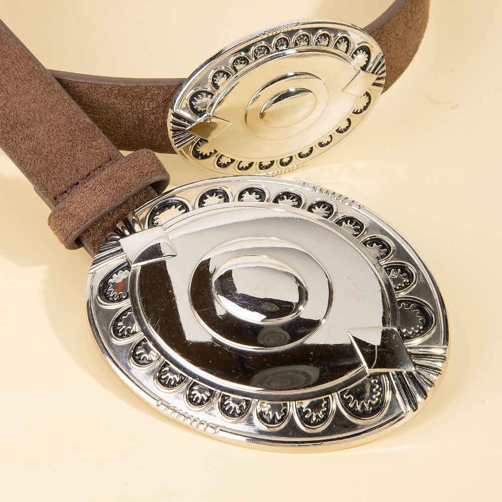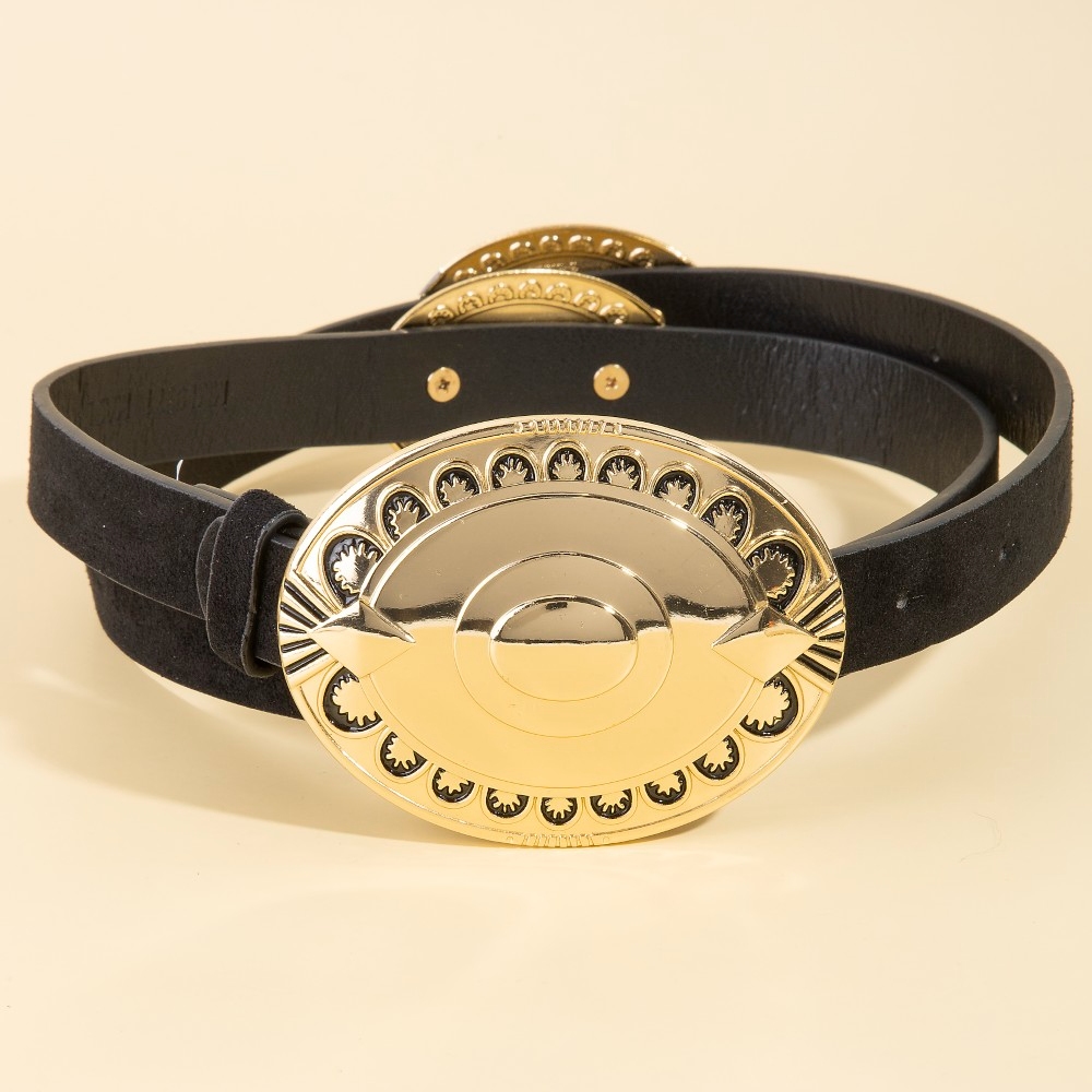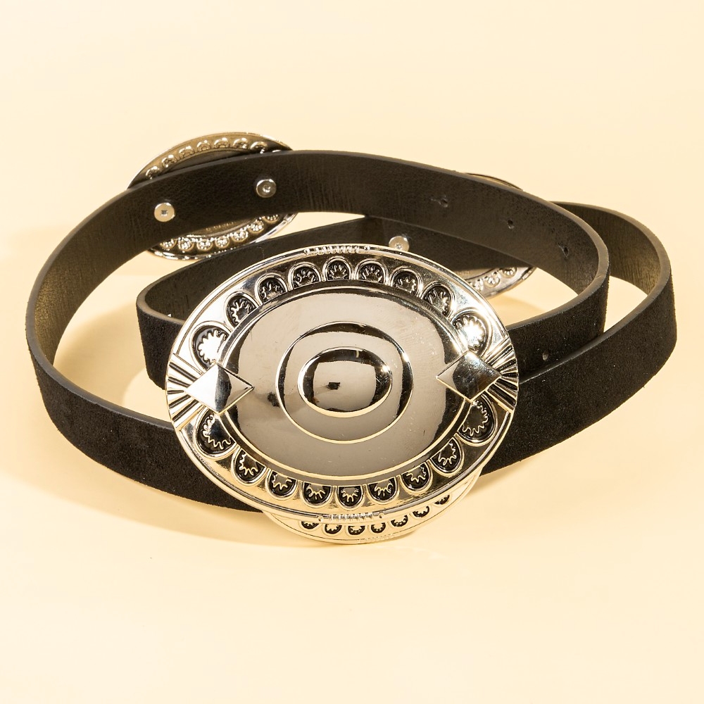 • This piece is designed to make a statement, this leather belt incorporates a flawless large oval concho disc design. This leather belt is the perfect way to add a touch of elegance to any outfit. Available in GBK, SBK, SCO. This item is sold in packs of 1.
