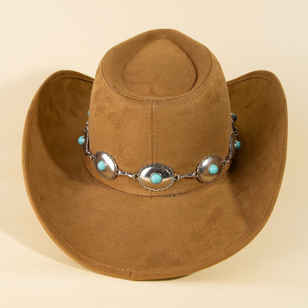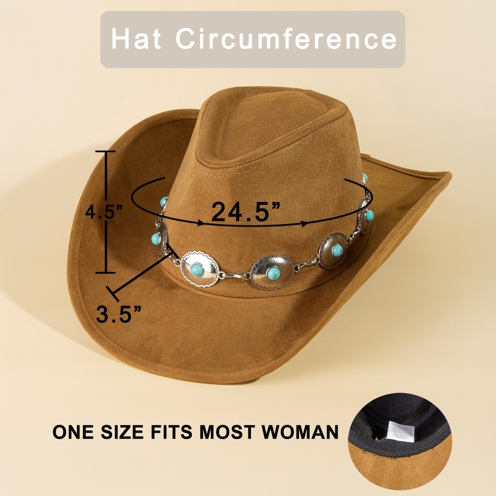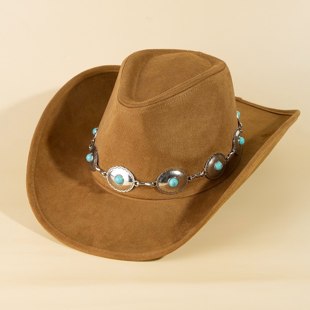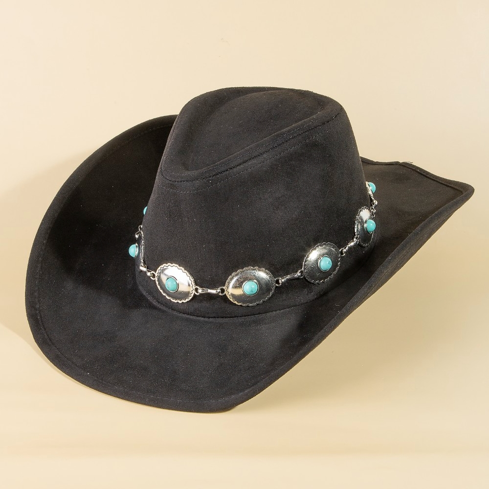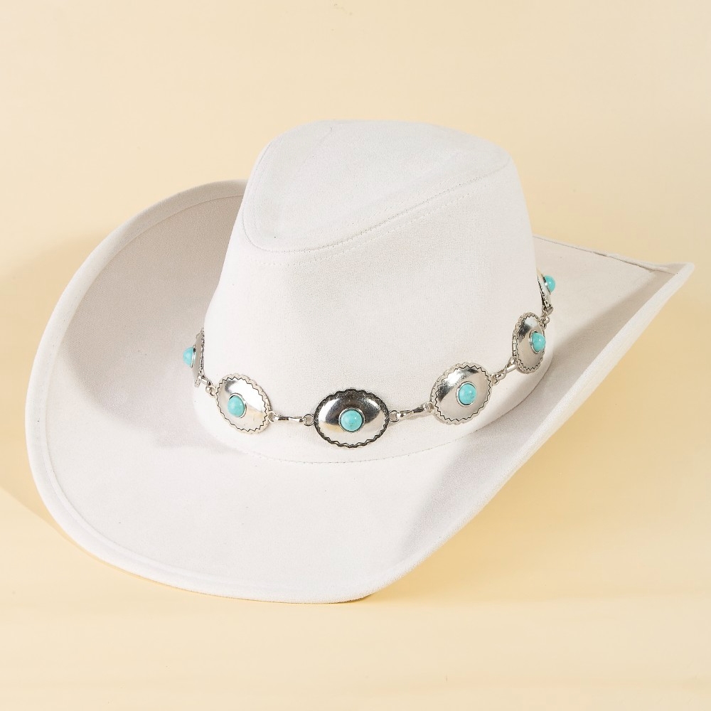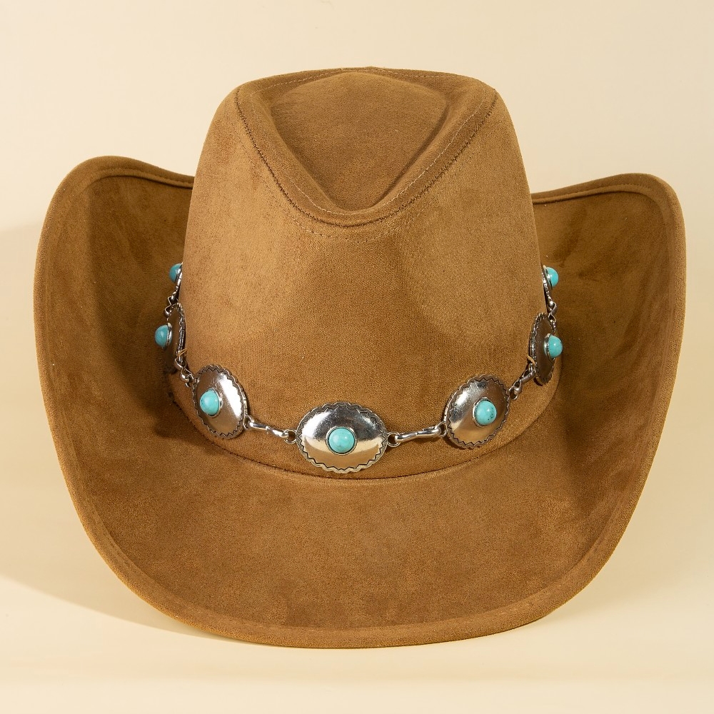 • The perfect way to elevate any outfit, this cowboy hat comes with a special western concho chain with turquoise detail design. Take your style to the next level by incorporating this versatile cowboy hat, a key element in achieving a polished look. Available in BR, IV, SBK, TP. This item is sold in packs of 1.