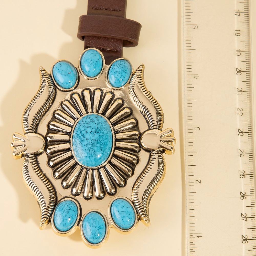 Hammered Oval Buckle Embroidered Vegan Leather Belt