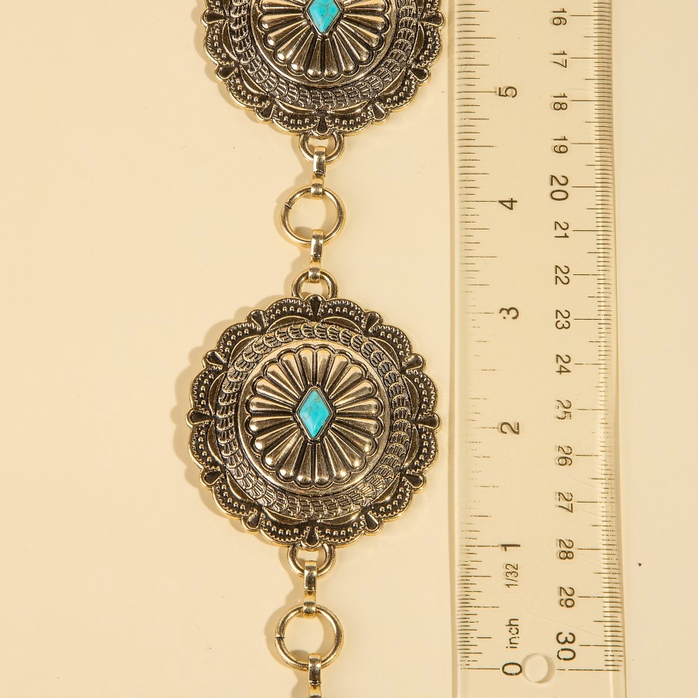 The epitome of sophistication and style, this chain belt features an exceptional detailed ornate disc concho design. Add a touch of glamour to your wardrobe with this versatile chain belt, perfect for enhancing the elegance of any look. Available in G, S. This item is sold in packs of 1.