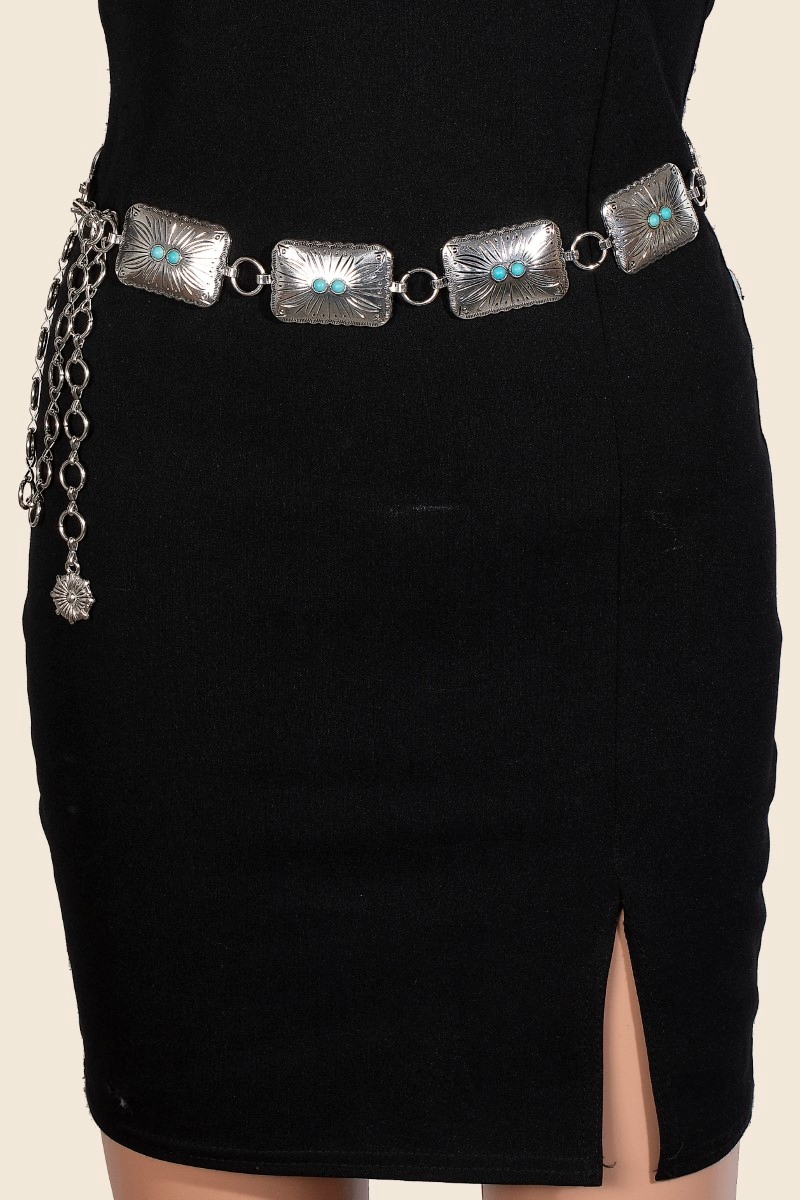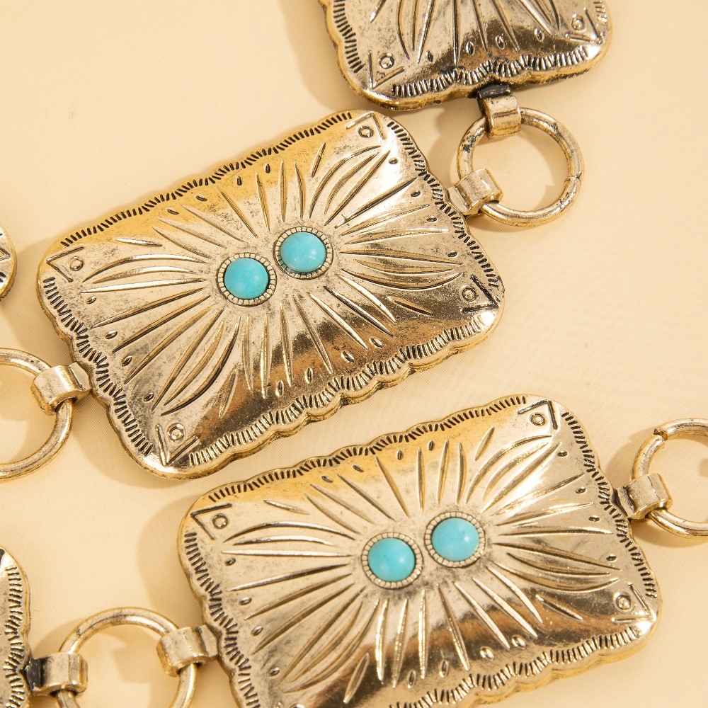 • Make a bold statement, this chain belt offers a remarkable double turquoise stud concho design. Embrace fashion flexibility with this versatile chain belt, designed to effortlessly enhance the sophistication of any outfit. Available in G, S. This item is sold in packs of 1.