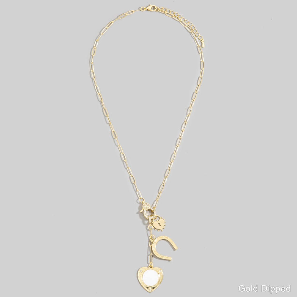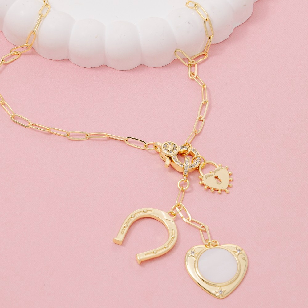 • A true work of art, this chain necklace encompasses a grand gold dipped heart and horseshoe charms design. Unleash the charm of this versatile chain necklace, effortlessly turning any outfit into a fashion statement. Available in GOLD. This item is sold in packs of 1.