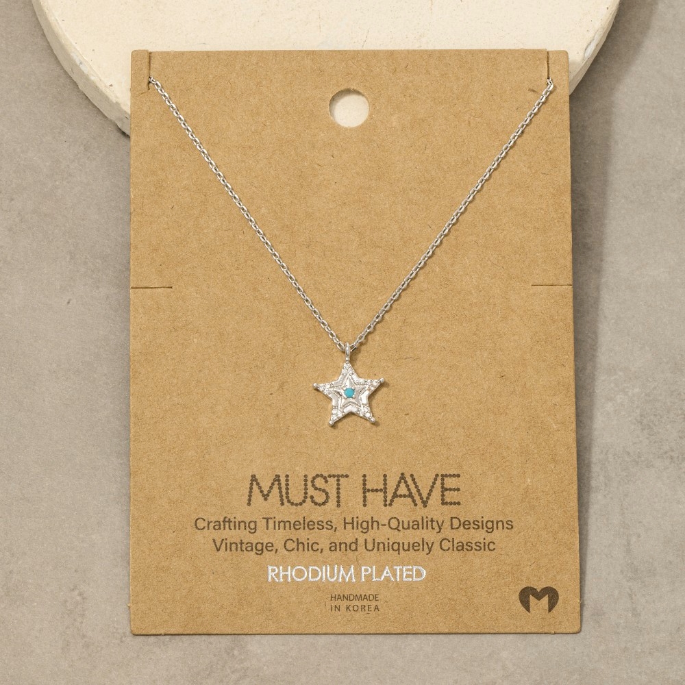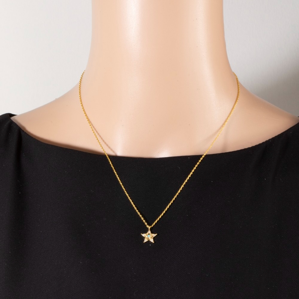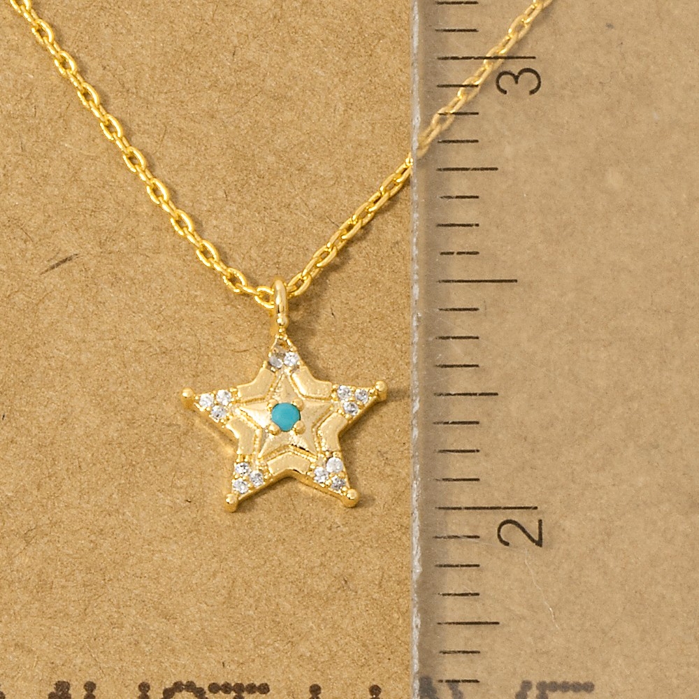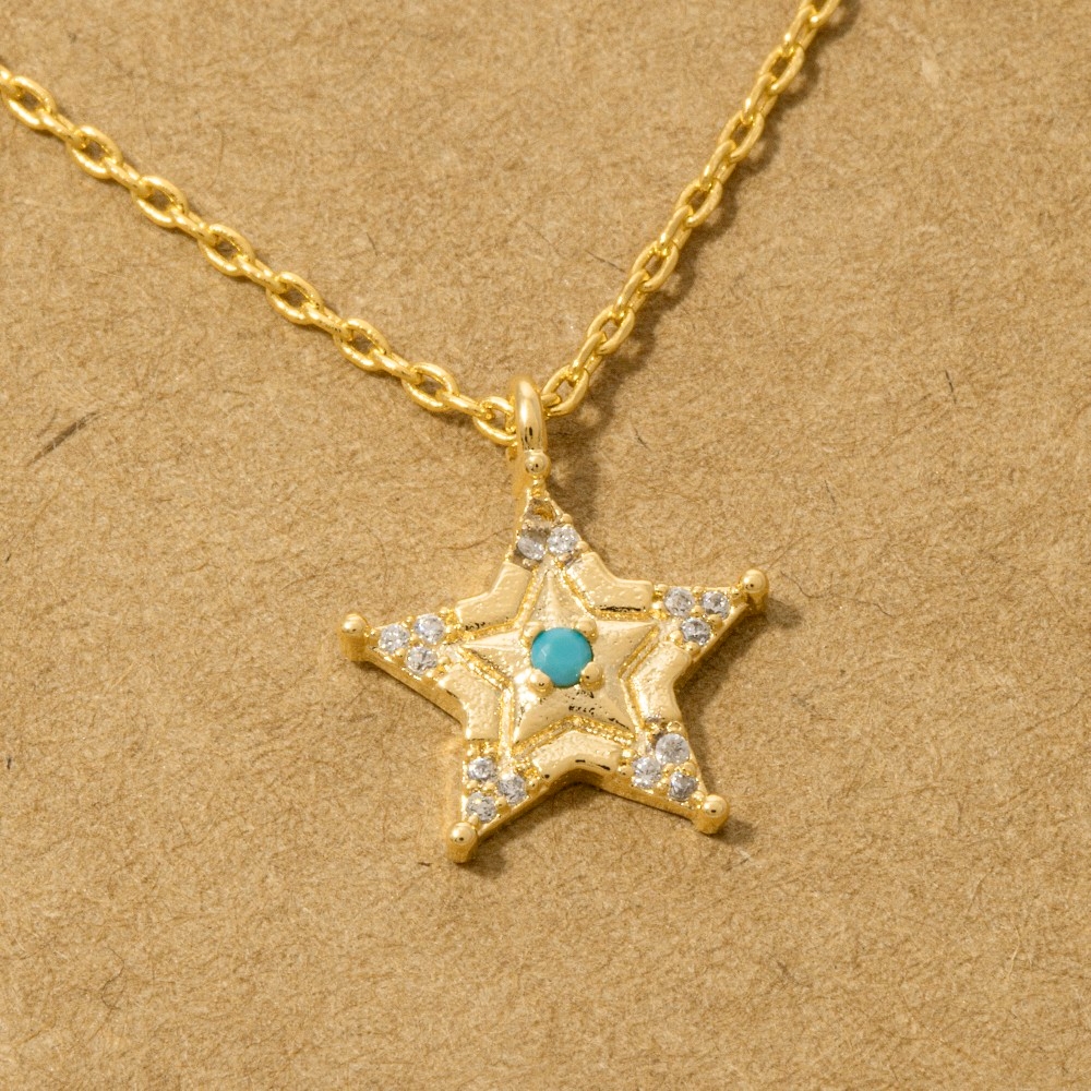 • An instant wardrobe staple, this pendant necklace embodies a sophisticated gold dipped turquoise and cubic zirconia star design. Redefine your fashion identity with this versatile pendant necklace, a timeless piece that complements any wardrobe. Available in G, R, S. This item is sold in packs of 1.