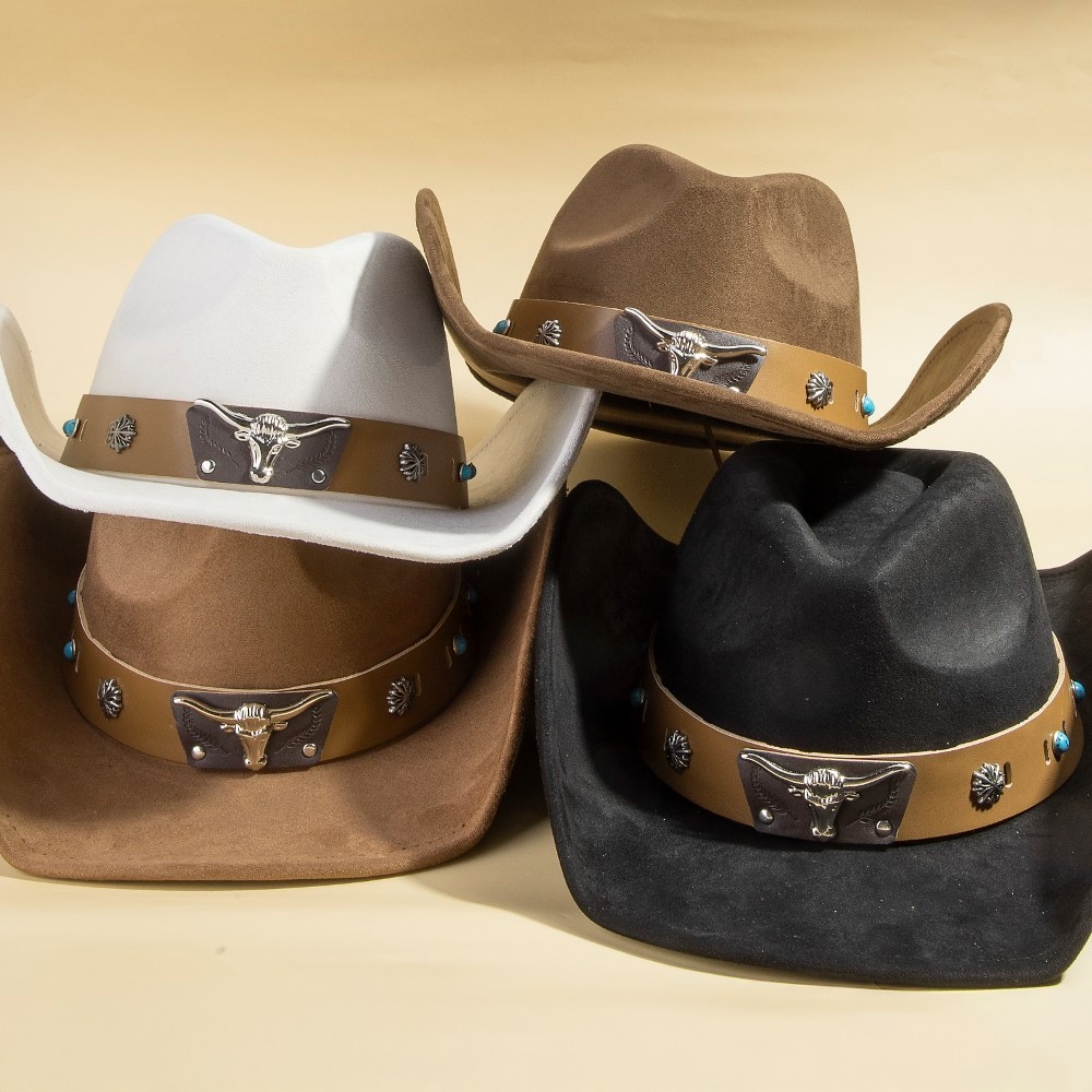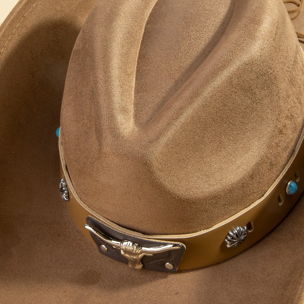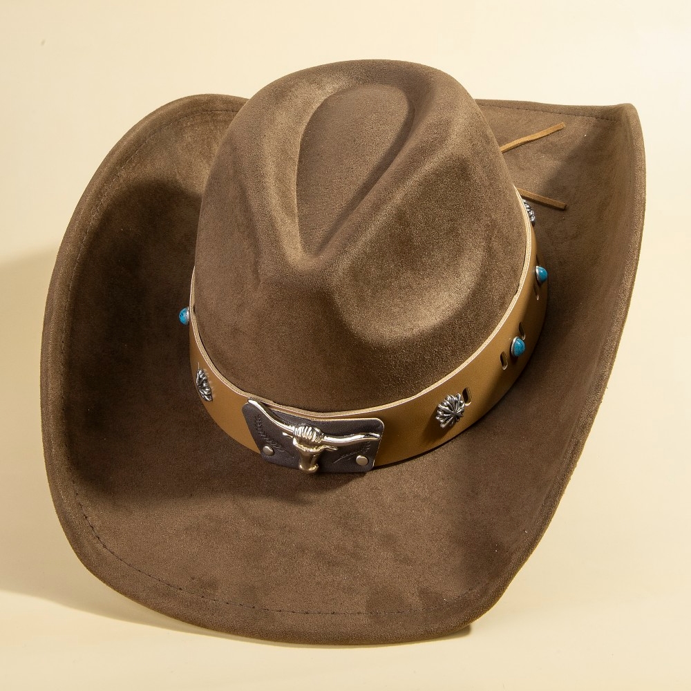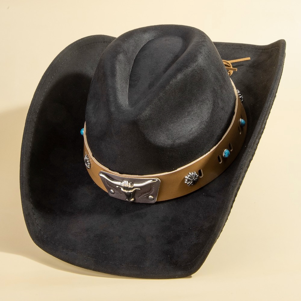 • The perfect way to add some sparkle to your outfit, this cowboy hat evokes a captivating western bull head concho accent leather strap suede design. Add a touch of glamour to your wardrobe with this versatile cowboy hat, perfect for enhancing the elegance of any look. Available in BK, DBR, IV, LBR. This item is sold in packs of 1.