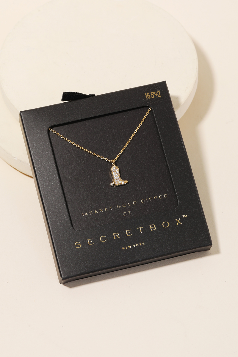 • Make a statement, this pendant necklace emanates an elegant secret box pave western cowboy boot design. This item is the perfect way to add some texture and interest to any outfit. Available in GD and WG. This item is sold in packs of 12.