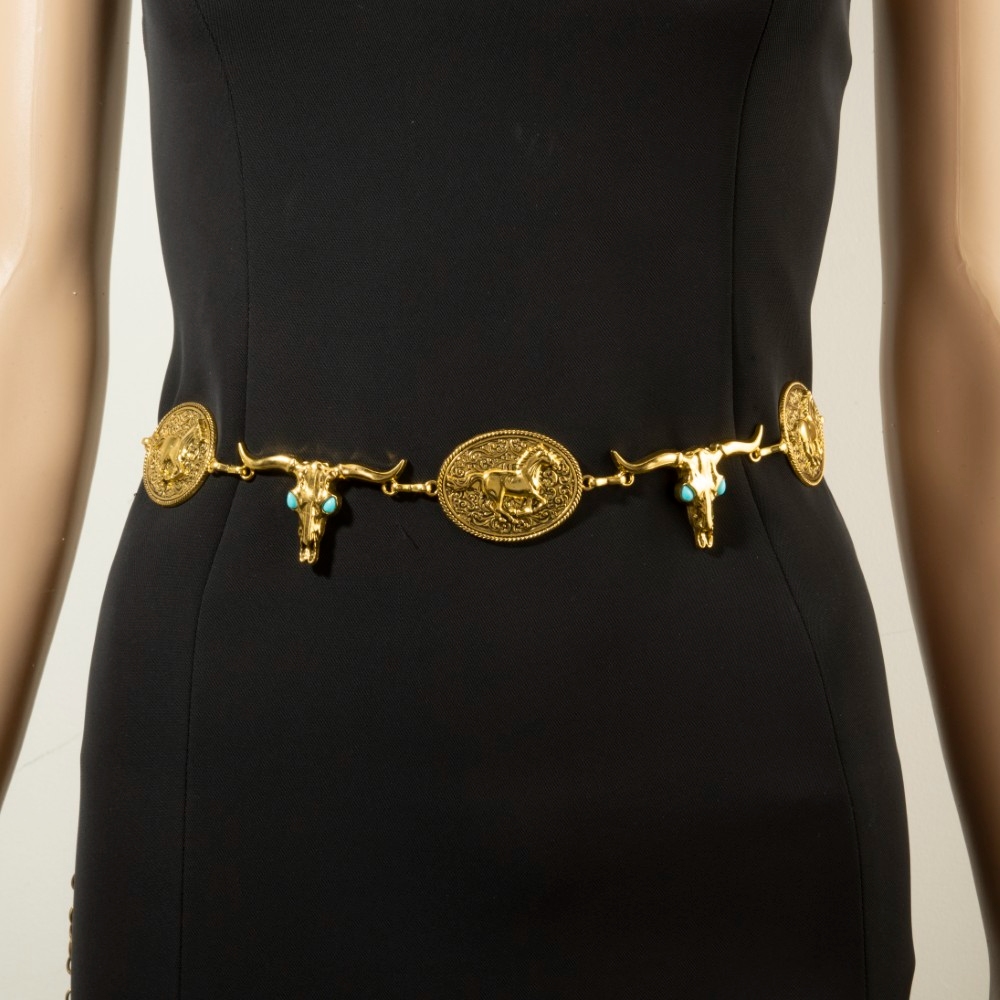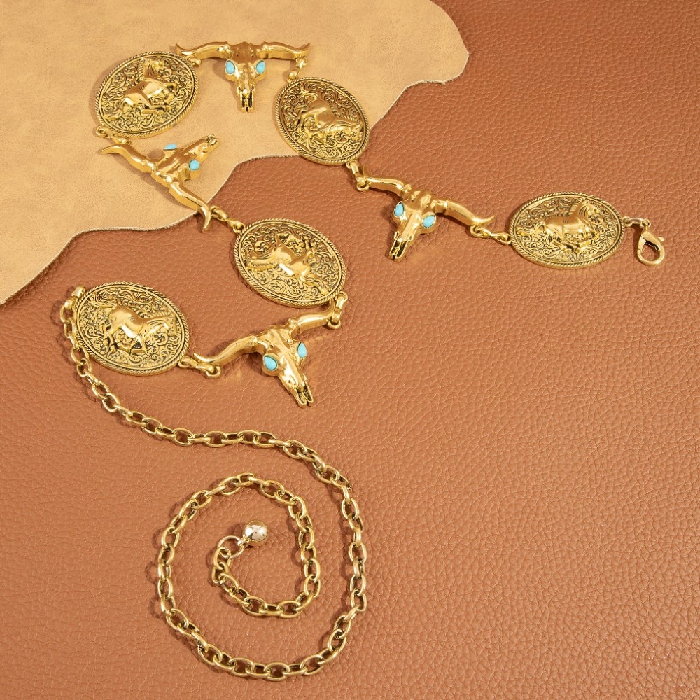 Make a statement, this chain belt contains a special longhorn skull & horse medallion design. Elevate your everyday style with this versatile chain belt, a simple yet impactful addition to your fashion repertoire. Available in G, RO. This item is sold in packs of 1.