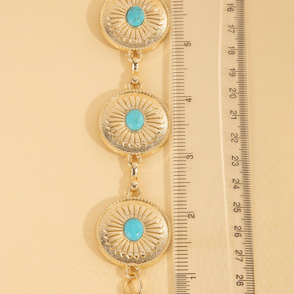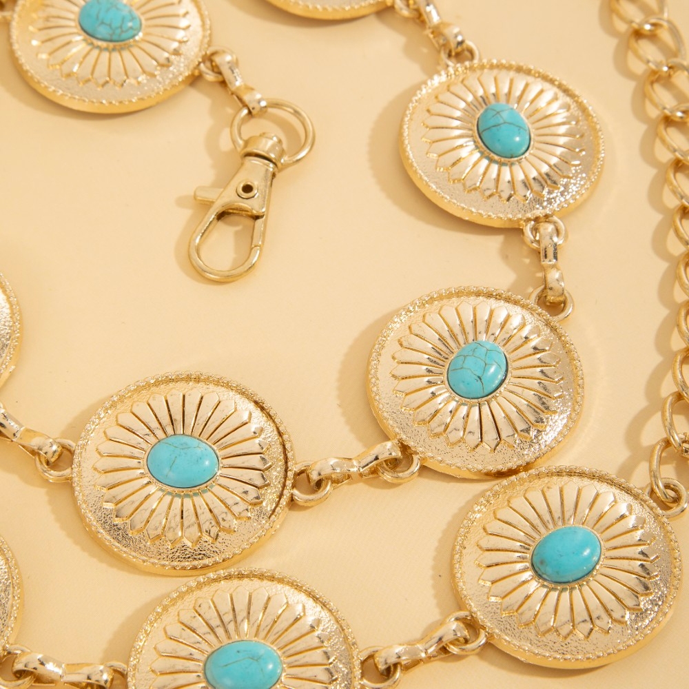 • This piece is both elegant and versatile, this chain belt features a distinct turquoise stud ornate disc concho design. Transform your outfit into a fashion masterpiece with this versatile chain belt, an essential for the style-conscious individual. Available in G, S. This item is sold in packs of 1.