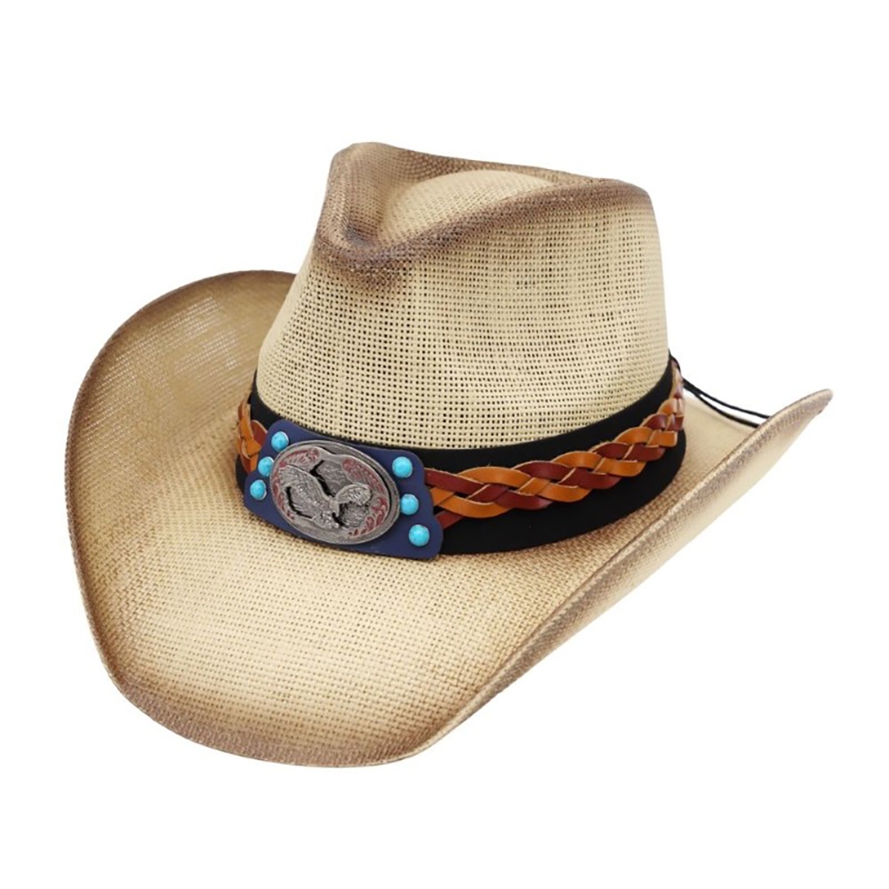 • A stunning piece that is sure to turn heads, this cowboy hat reveals an intricate western eagle strap straw design. Elevate your style effortlessly with this versatile cowboy hat, enhancing the appeal of any ensemble. Available in BE, DB, IV, TP. This item is sold in packs of 1.