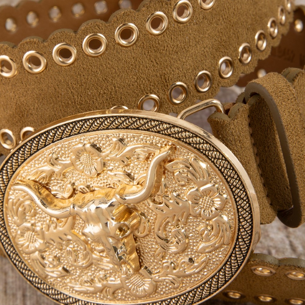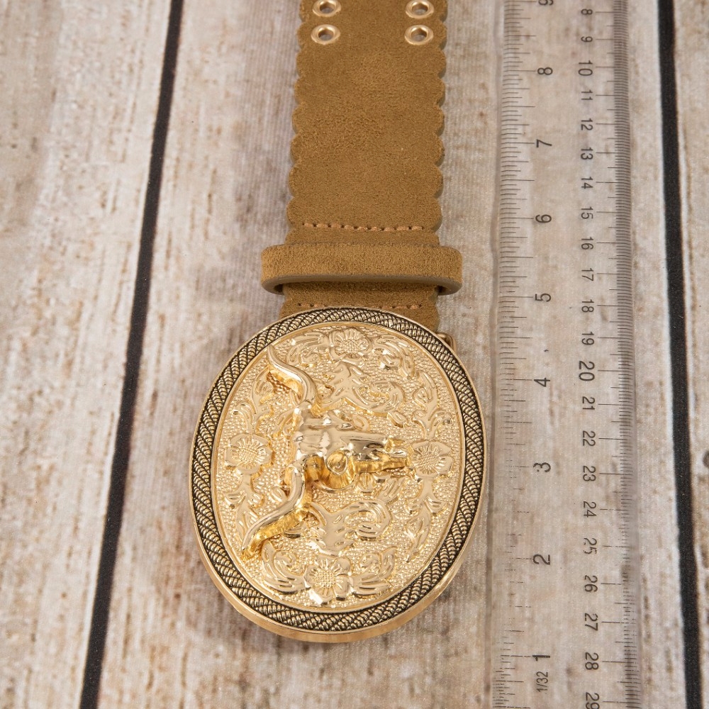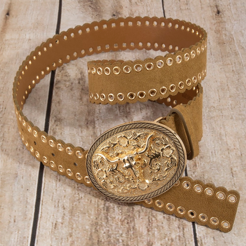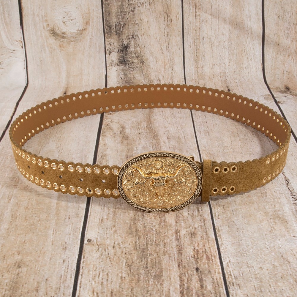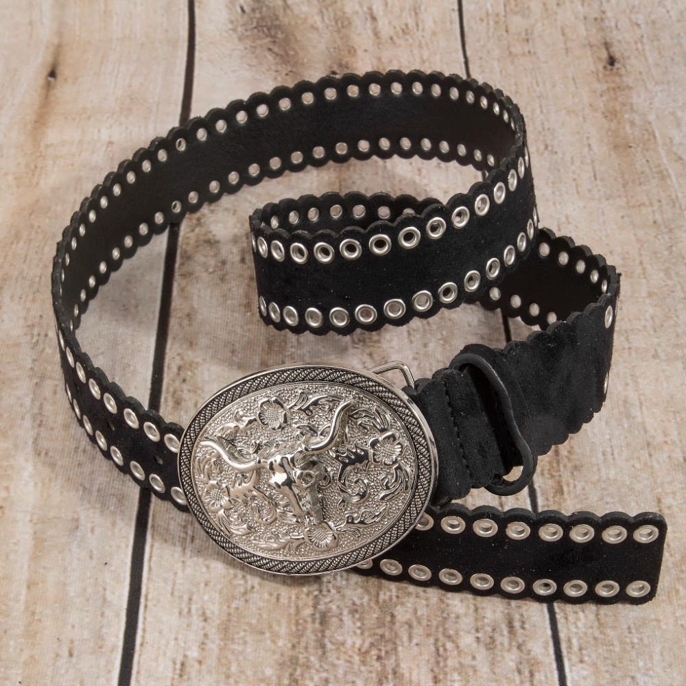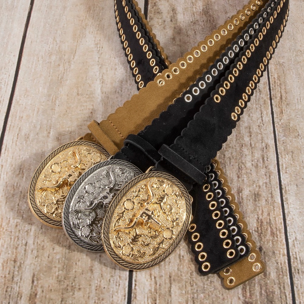 • A bold and daring choice, perfect for those who want to stand out from the crowd, this leather belt emanates an elegant western grommet oval longhorn buckle vegan design. Elevate your everyday style with this versatile leather belt, a simple yet impactful addition to your fashion repertoire. Available in GBK, GBR, SBK. This item is sold in packs of 1.