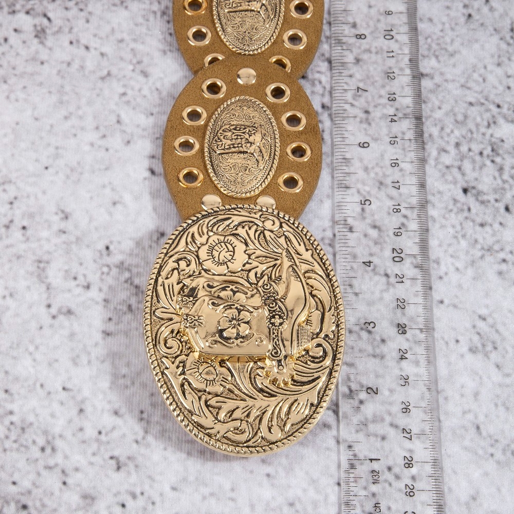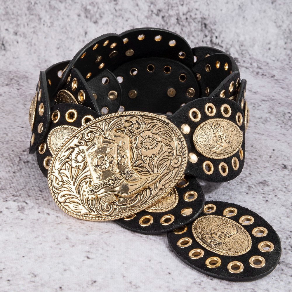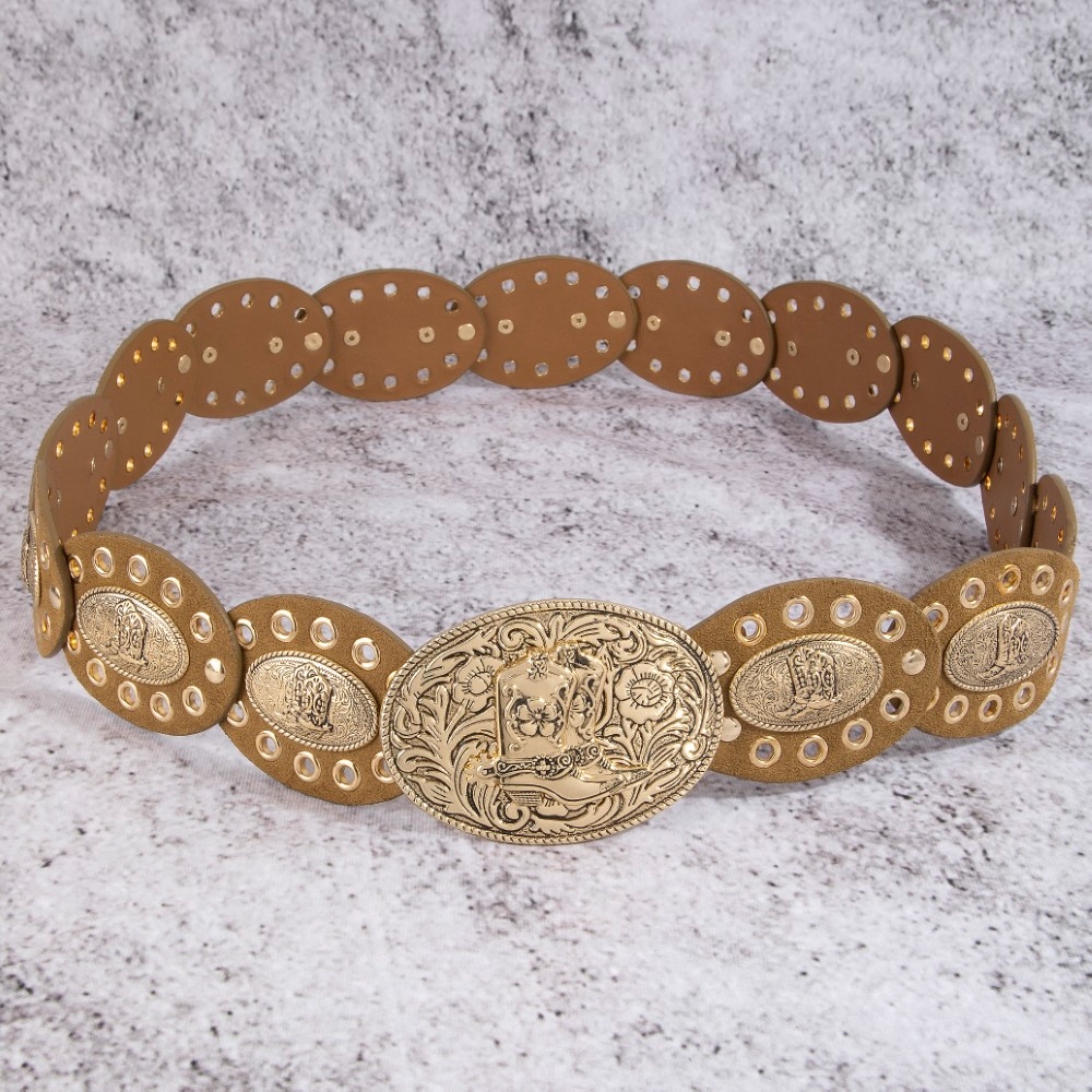 • Make a statement, this leather belt introduces an exceptional western oval concho vegan design. Infuse elegance into your daily wardrobe with the versatile charm of this must-have leather belt. Available in GBK, GBR, SBK. This item is sold in packs of 1.