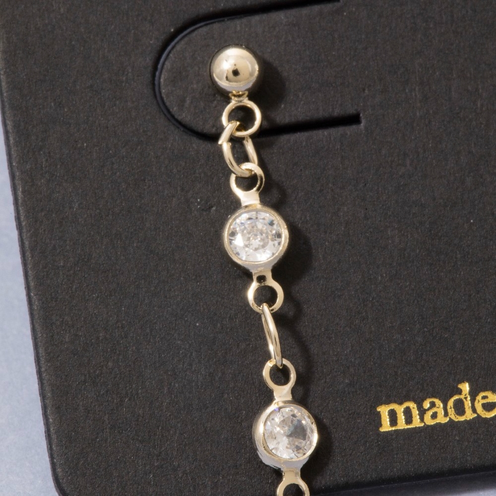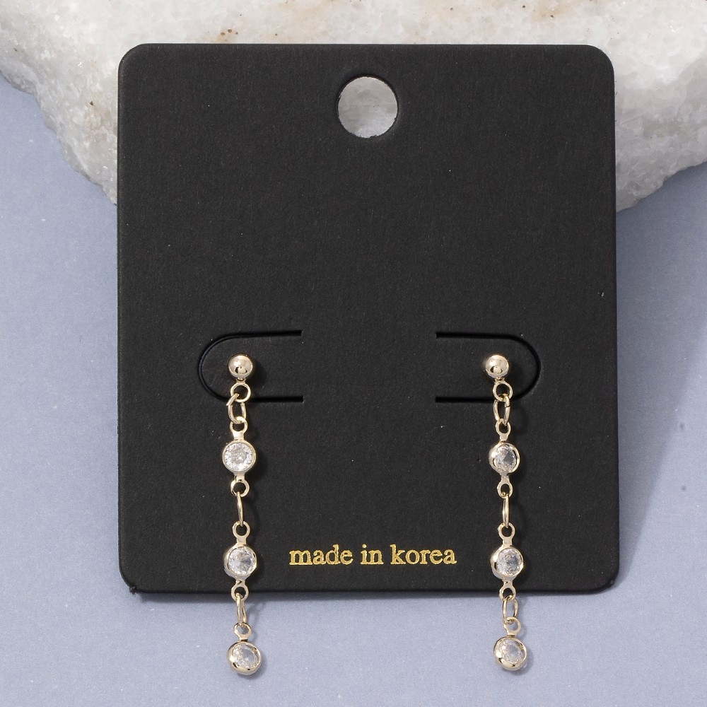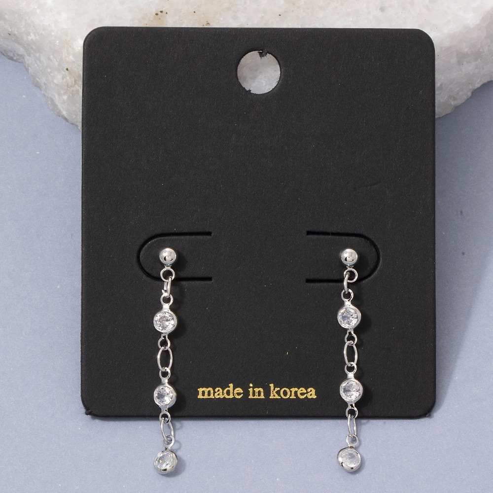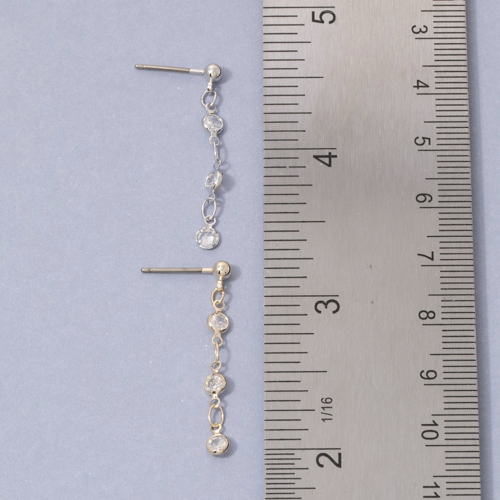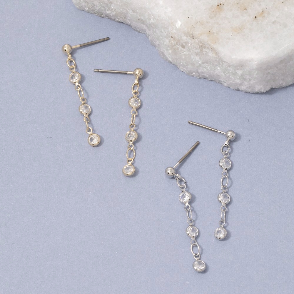 Effortlessly elevate your style, this pair of drop earrings incorporates a flawless triple cubic zirconia station chain design. Perfect for adding a touch of glamour and sophistication to any outfit, this pair of drop earrings is a must-have. Available in G, S. This item is sold in packs of 1.