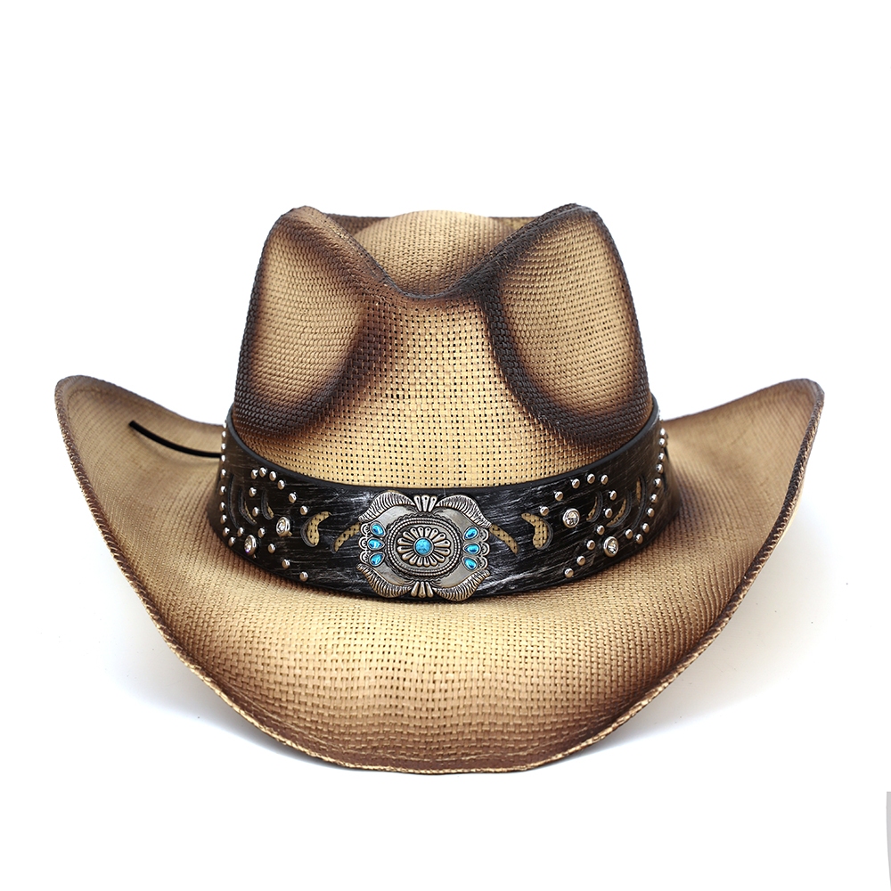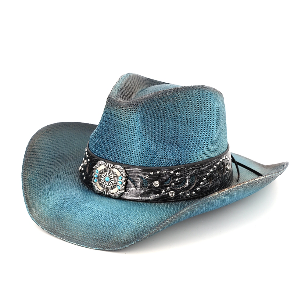 • Add some edge to your look, this cowboy hat flaunts a luxurious silver concho turquoise band straw design. Redefine your fashion identity with this versatile cowboy hat, a timeless piece that complements any wardrobe. Available in BE, DB, TP. This item is sold in packs of 1.