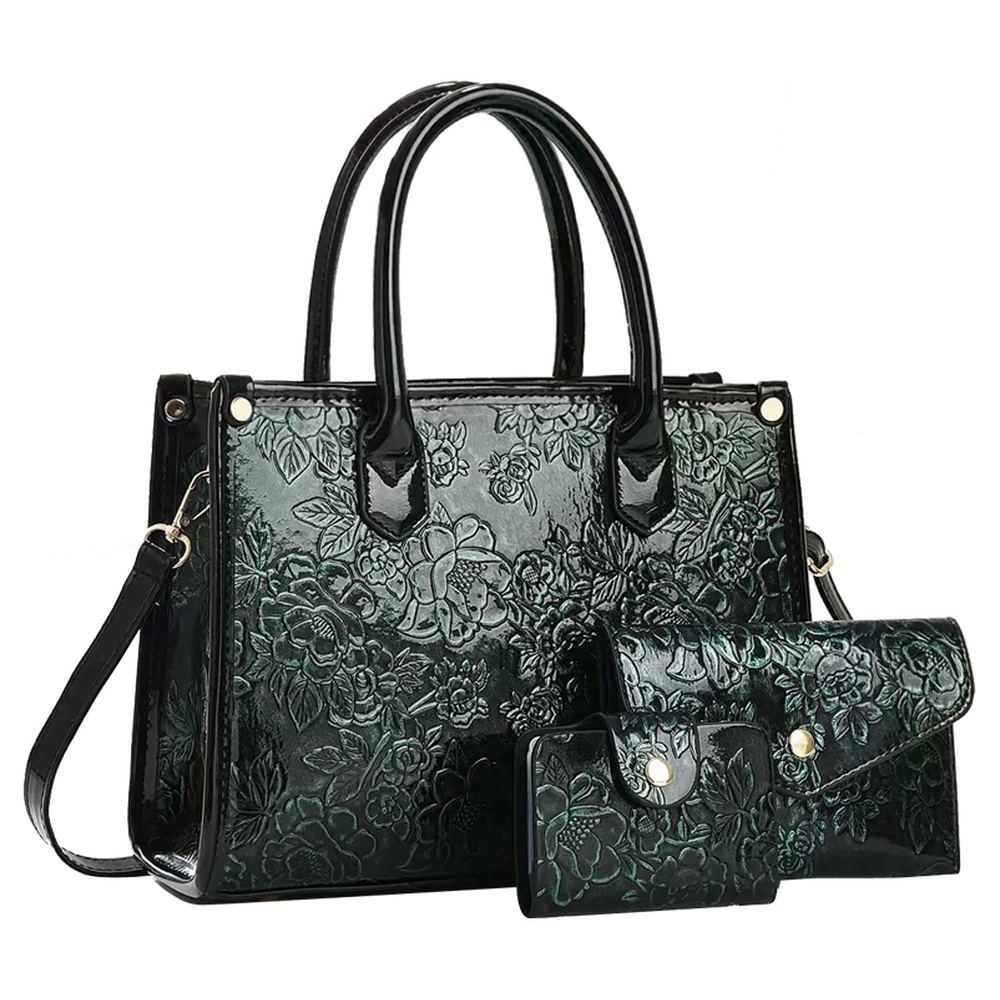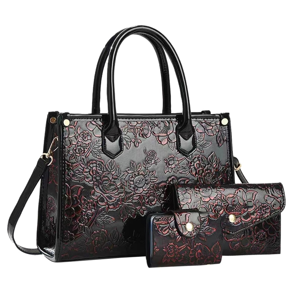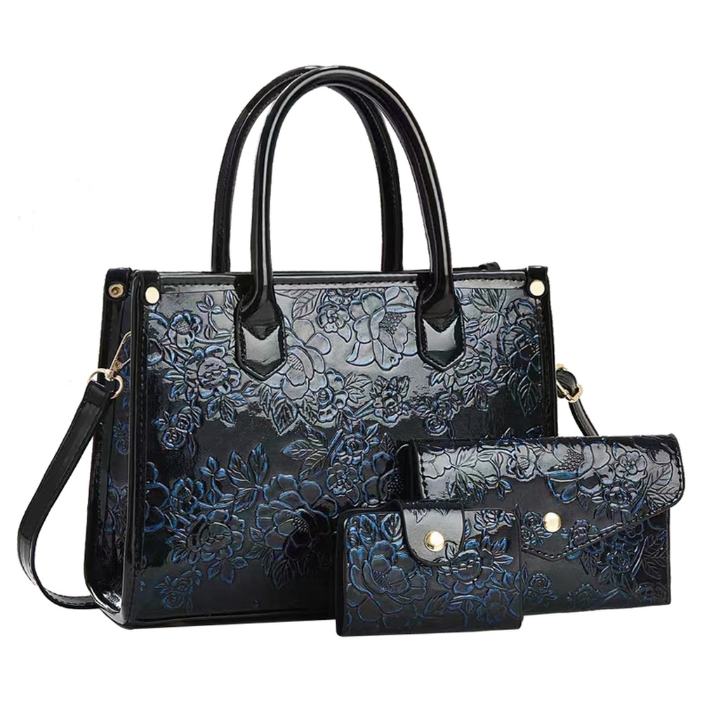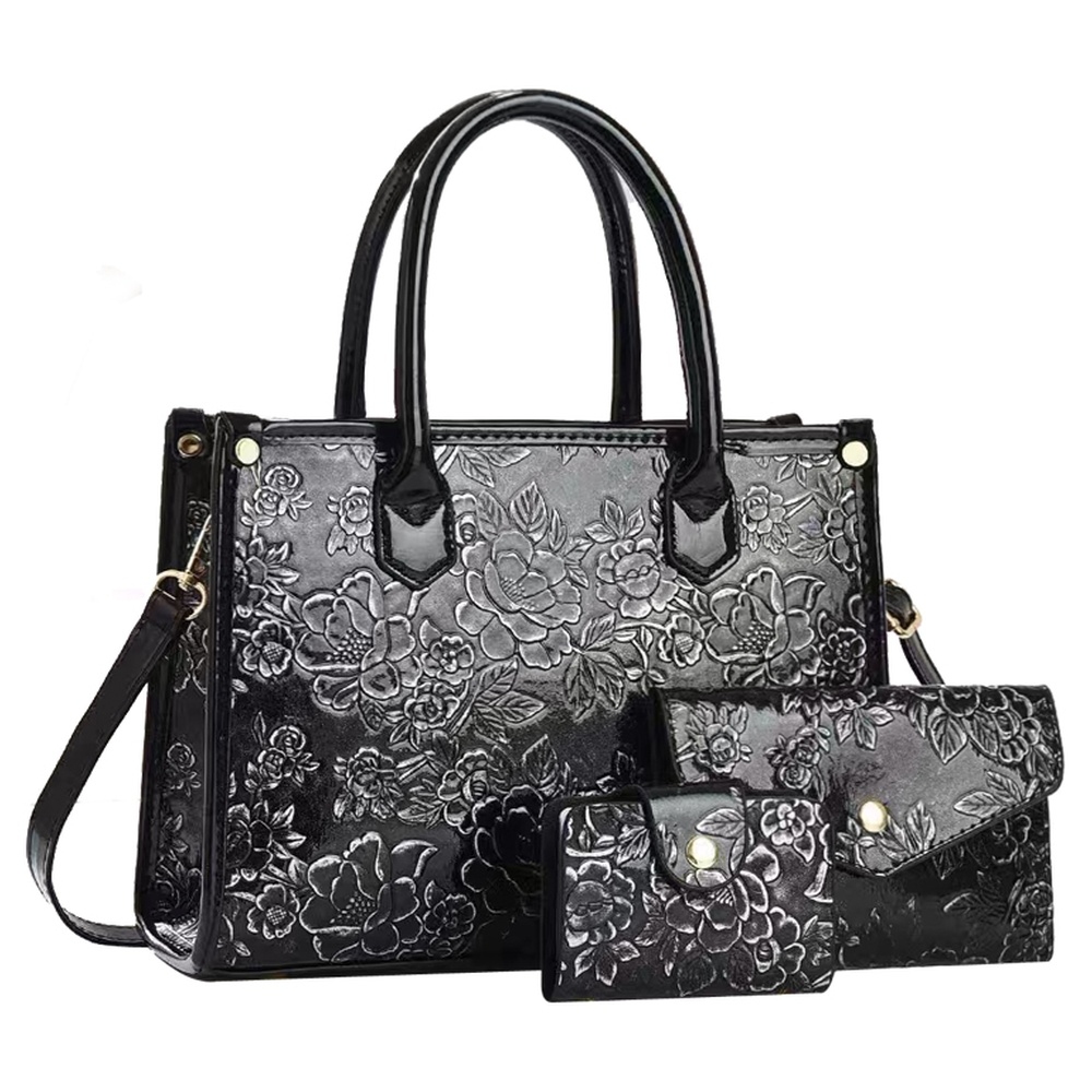 The epitome of sophistication and style, this hand bag showcases a breathtaking embossed flower 3 in 1 satchel set design. Add a touch of glamour to your wardrobe with this versatile hand bag, perfect for enhancing the elegance of any look. Available in BL, GN, PP, RD, WT. This item is sold in packs of 1.