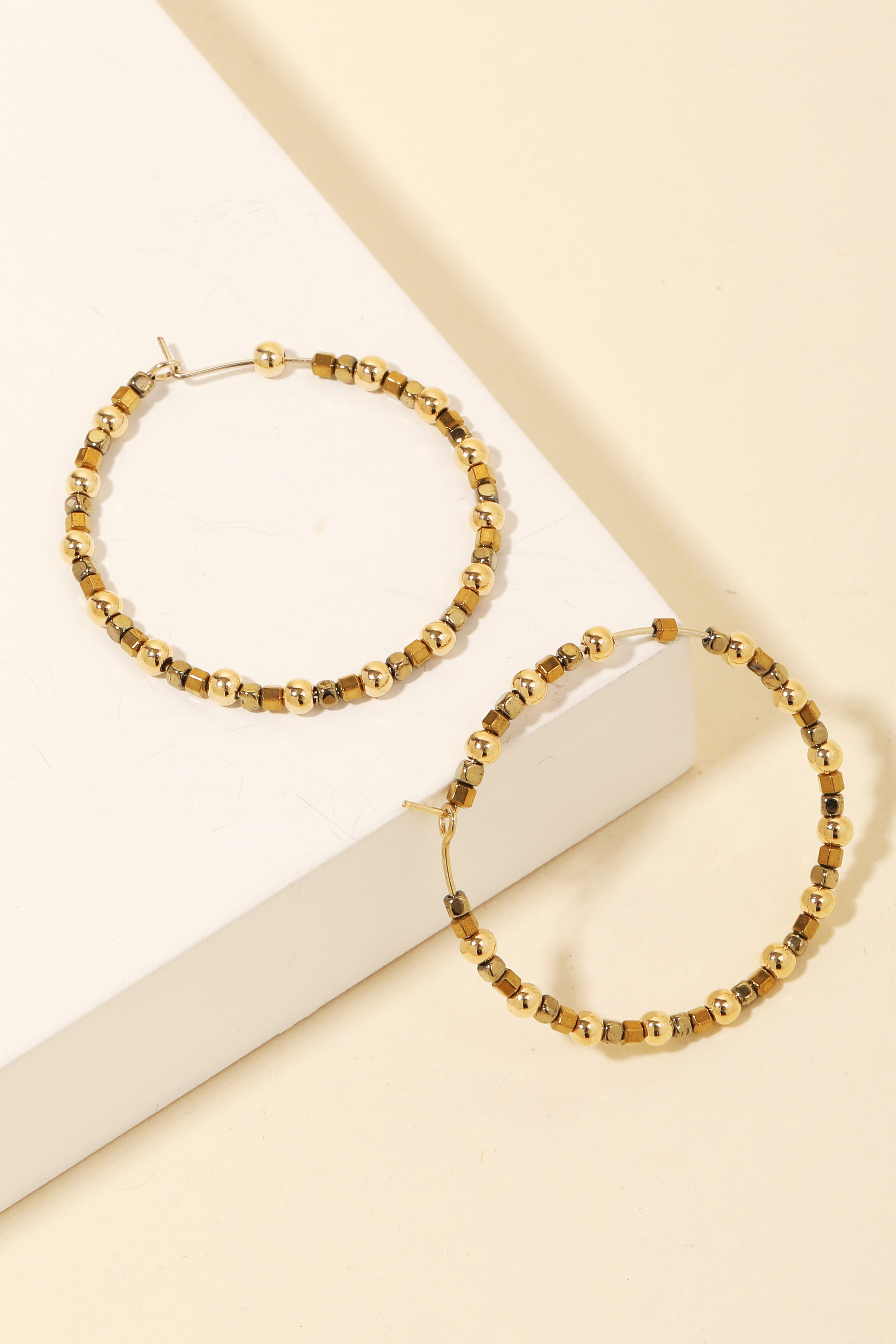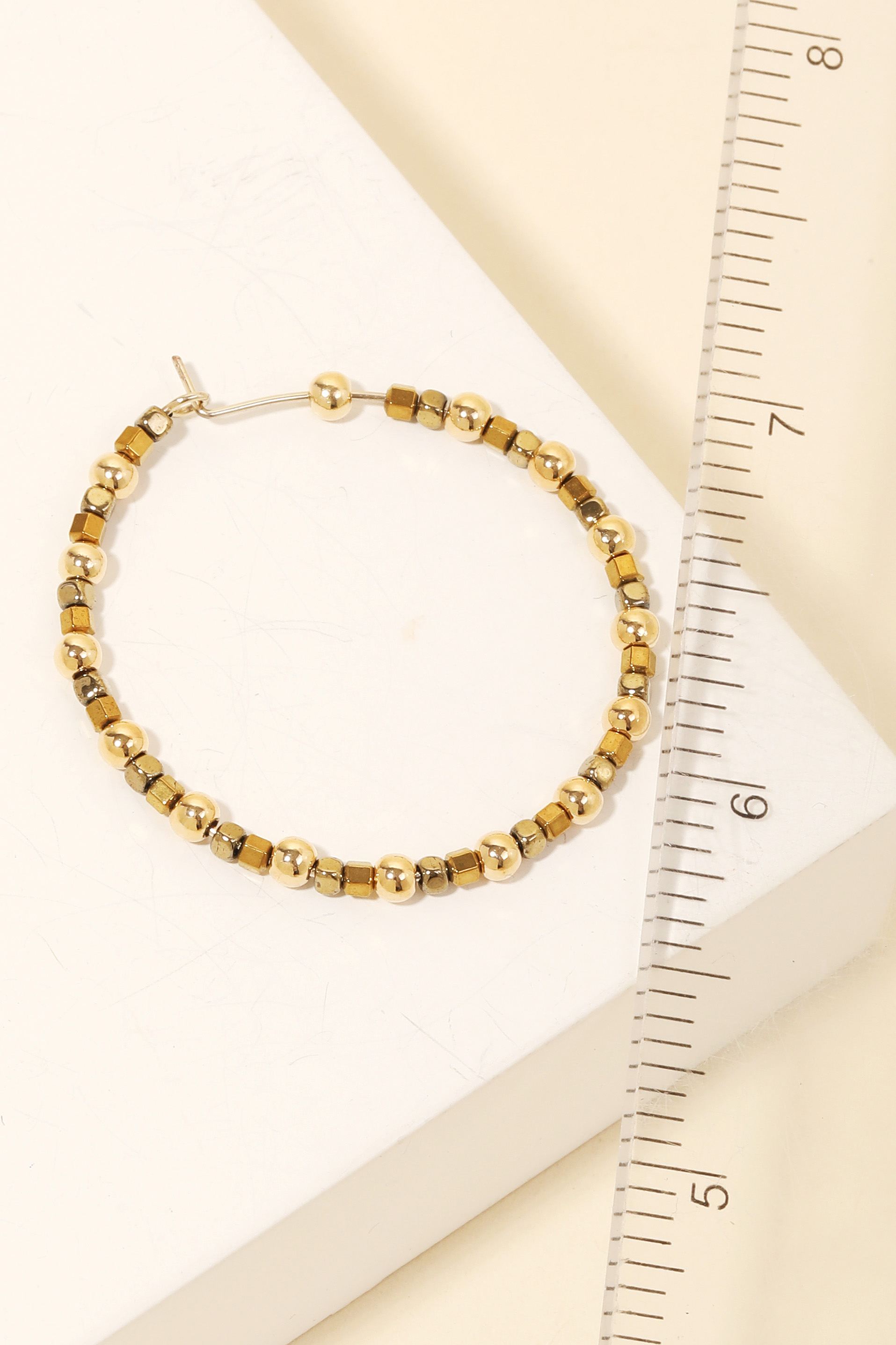 • Stay on-trend and ahead of the fashion curve, this pair of hoop earrings embodies a sophisticated assorted wire bead design. Elevate your fashion statement with this versatile accessory, adding a touch of glamour to your everyday look. Available in G. This item is sold in packs of 1.