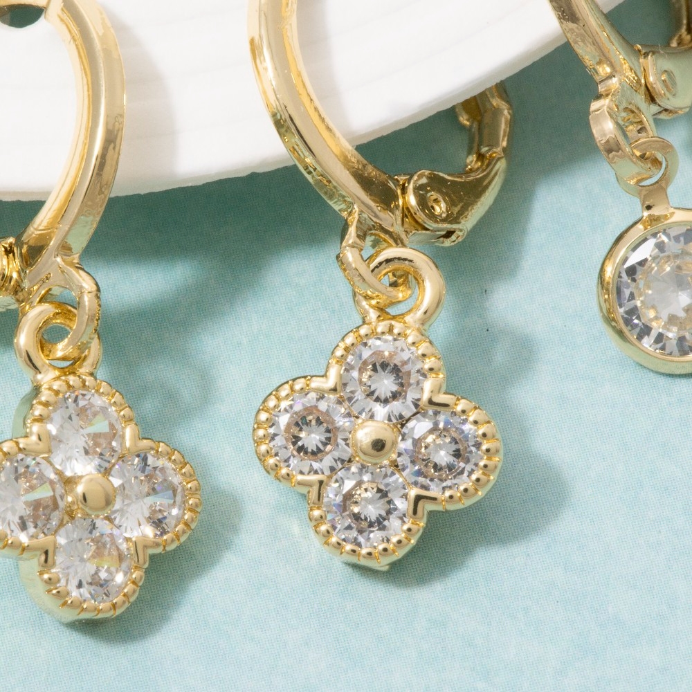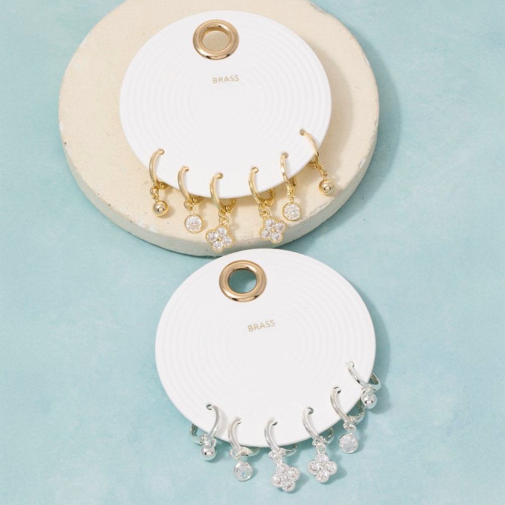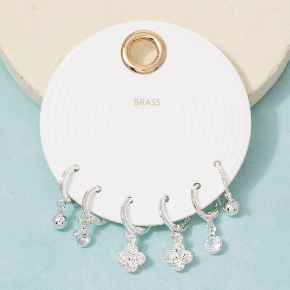 A must-have for any fashion-forward individual, this pair of earrings highlights a special cz clover and ball charm hoop earring set design. This item is perfect for anyone who loves to accessorize and add some personality to their outfits. Available in GCL, SCL. This item is sold in packs of 1.