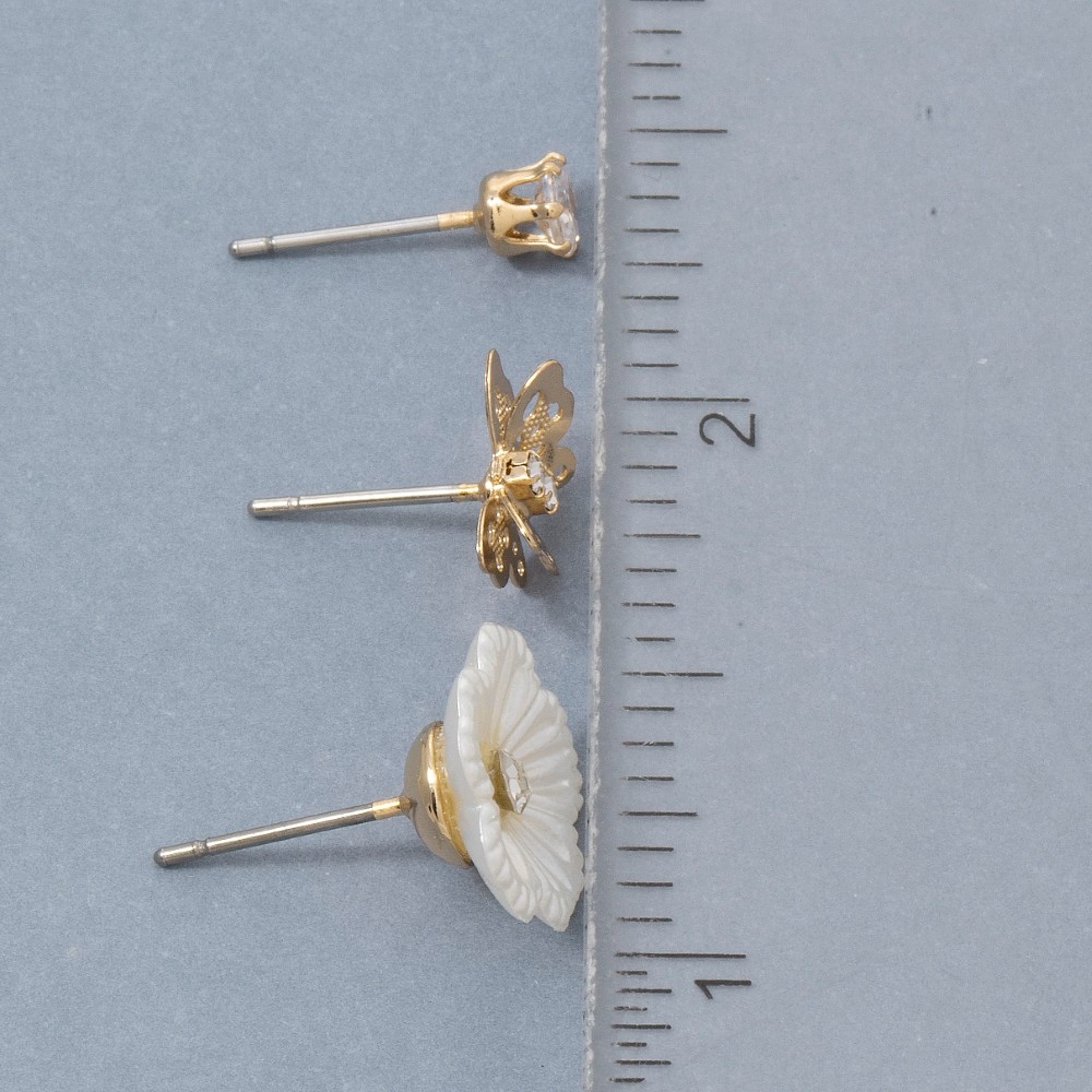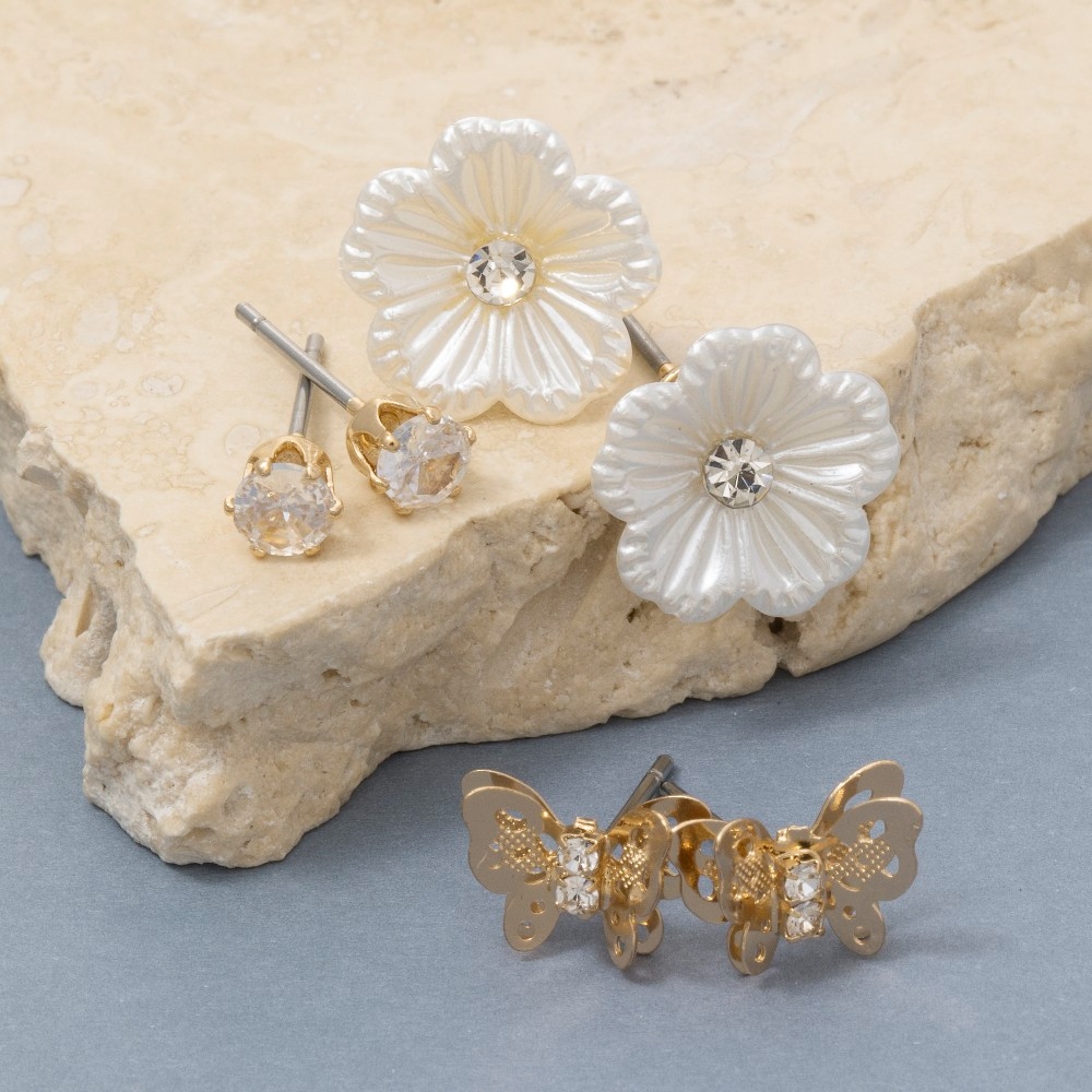 • Add a touch of luxury to any outfit, this pair of earrings highlights a special assorted three pair butterfly and flower earring set design. This pair of earrings is the perfect way to add a touch of elegance to any outfit. Available in GD. This item is sold in packs of 1.
